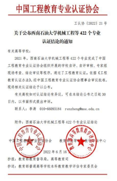 近日,中国工程教育认证协会公布了《关于公布西南石油大学机械工程等422个专业认证结论的通知》(工认协〔2022〕21号),开云(中国)环境工程和金属材料工程专业通过认证,认证时效为6年,即2022年1月至2027年12月(有条件)。