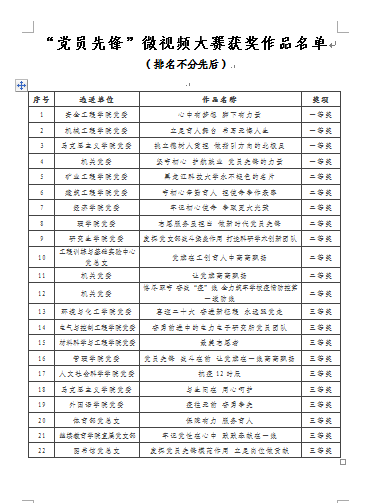 经过评选,安全工程学院党委选送的《心中有梦想 脚下有力量》、机械工程学院党委选送的《立足育人舞台 书写无悔人生》、马克思主义学院党委选送的《挑立德树人重担 做指引方向的北极星》、机关党委选送的《坚守初心 护航就业 党员先锋的力量》等4部作品荣获一等奖,矿业工程学院党委选送的《开云app登录入口永不褪色的名片》等8部作品荣获二等奖,环境与化工学院党委选送的《喜迎二十大 奋进新征程 永远跟党走》等10部作品荣获三等奖。