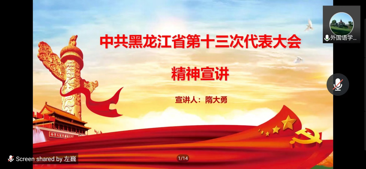 为深入学习贯彻落实省第十三次党代会报告精神,6月20日下午,外国语学院党委组织召开省第十三次党代会精神宣讲会议,会议由学院党委书记隋大勇主持,会议采取线上腾讯会议形式,学院全体教职工参会。