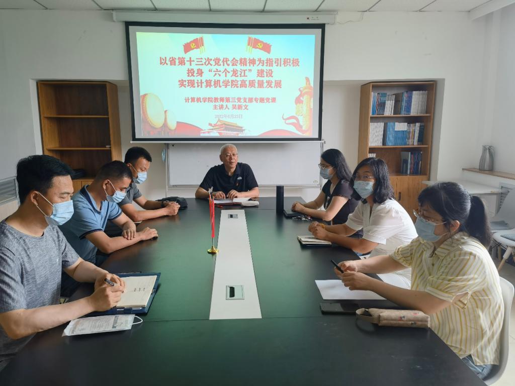6月23日上午,计算机学院党委书记吴新文《以省第十三次党代会精神为指引,积极投身“六个龙江”建设,实现计算机学院高质量发展》为题,做主题宣讲。教师第三党支部党员在线下参加会议,其他教职工在线上聆听了宣讲。