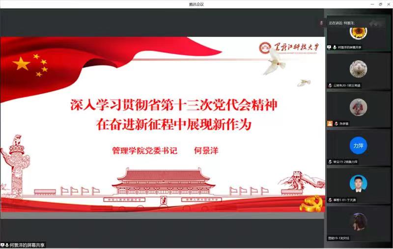 6月27日,管理学院线上再次召开省第十三次党代会精神专题宣讲会,由学校宣讲团成员、学院党委书记何景洋为全体学生党员做宣讲。何景洋从本次党代会召开的重大意义、报告的总体定位与基本框架、深刻理解龙江未来五年振兴发展的发展方向、牢牢把握龙江未来五年振兴发展的主要任务等方面进行了详细解读和阐释。