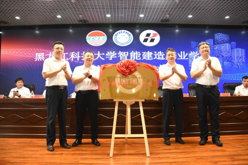 陈凯云副校长分别与黑龙江省建工集团有限责任公司总经理石新波、龙建路桥有限公司总经理宁长远为共建智能建造产业学院现场签约。周宏力书记、孟上九校长、石新波总经理、宁长远总经理共同为智能建造产业学院揭牌。