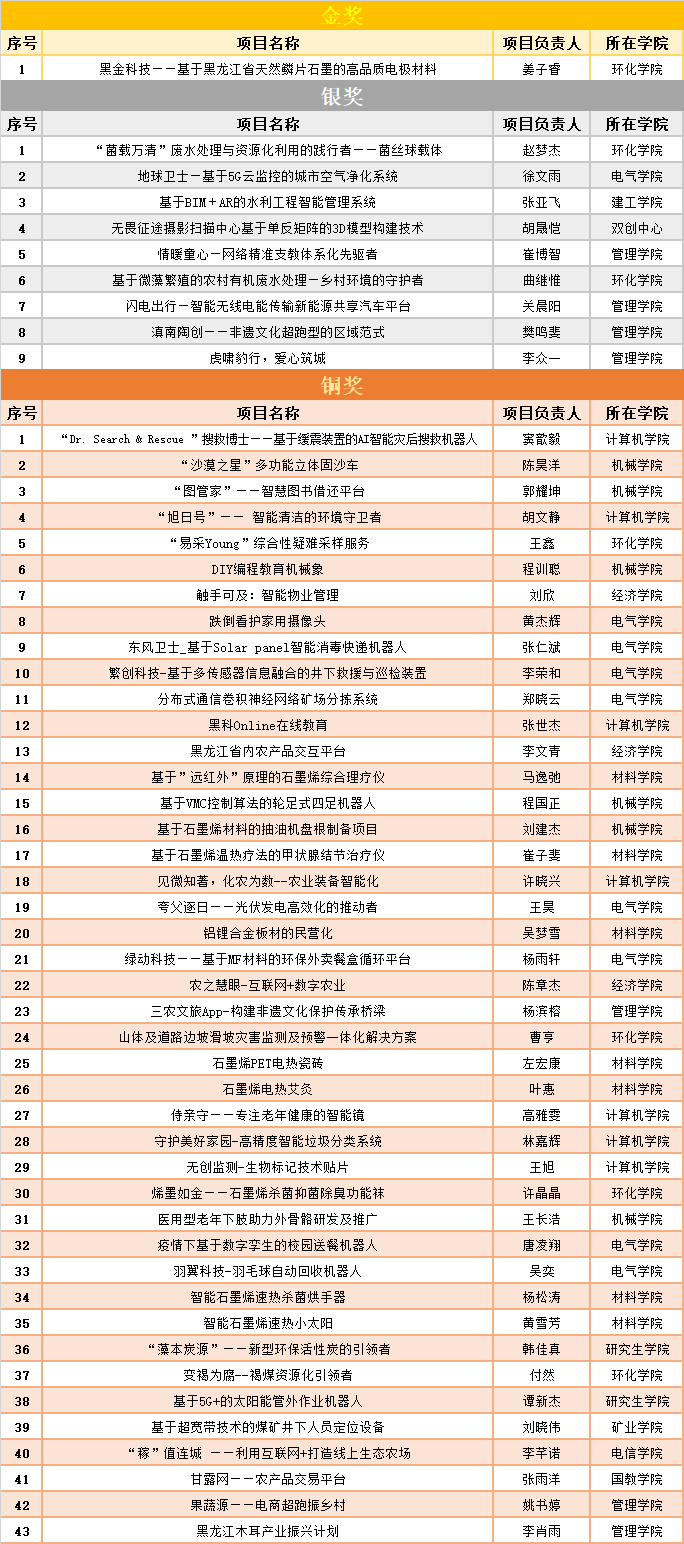 环境19-1班姜子睿团队的参赛项目《黑金科技——基于黑龙江省天然鳞片石墨的高品质电极材料》荣获大赛金奖,同时在金奖排位赛中成功入围国赛;《“菌载万清”废水处理与资源化利用的践行者——菌丝球载体》等9个参赛项目荣获大赛银奖;《“Dr. Search & Rescue”搜救博士——基于缓震装置的AI智能灾后搜救机器人》等43个参赛项目荣获大赛铜奖。