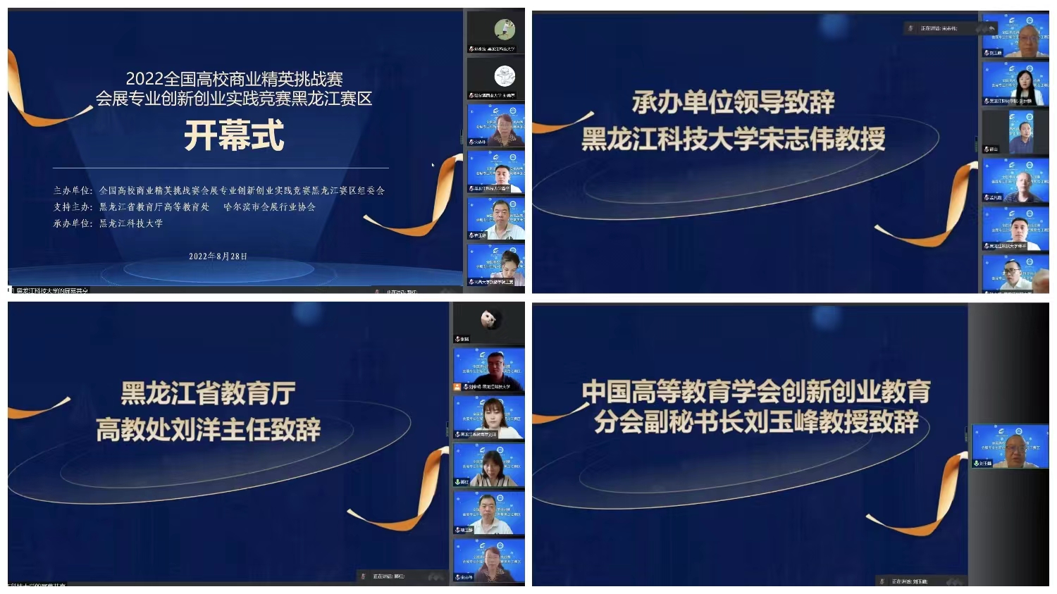 黑龙江省教育厅高教处主任刘洋,中国高等教育学会创新创业教育分会副秘书长、黑龙江省普通高等学校创新创业工作指导委员会副秘书长、黑龙江省创业教育学会秘书长刘玉峰,中国国际贸易促进委员会商业行业委员会、全国高校商业精英挑战赛组委会姚歆教授分别致辞。黑龙江赛区秘书长、经济学院院长孙永波做有关竞赛实况和评审规则的说明,哈尔滨商业大学会展经济与管理专业学生孙雨亭代表全体参赛学生进行发言,开云(中国)经济学院专创融合跨境电商实验班负责人籍丹宁教授代表全体指导教师进行发言,黑龙江生态工程职业学院会展策划与管理专业曲思嘉同学代表全体参赛学生进行宣誓,全国高校商业精英挑战赛会展专业创新创业实践赛吉林赛区负责人赵可心代表全体裁判员进行宣誓。
