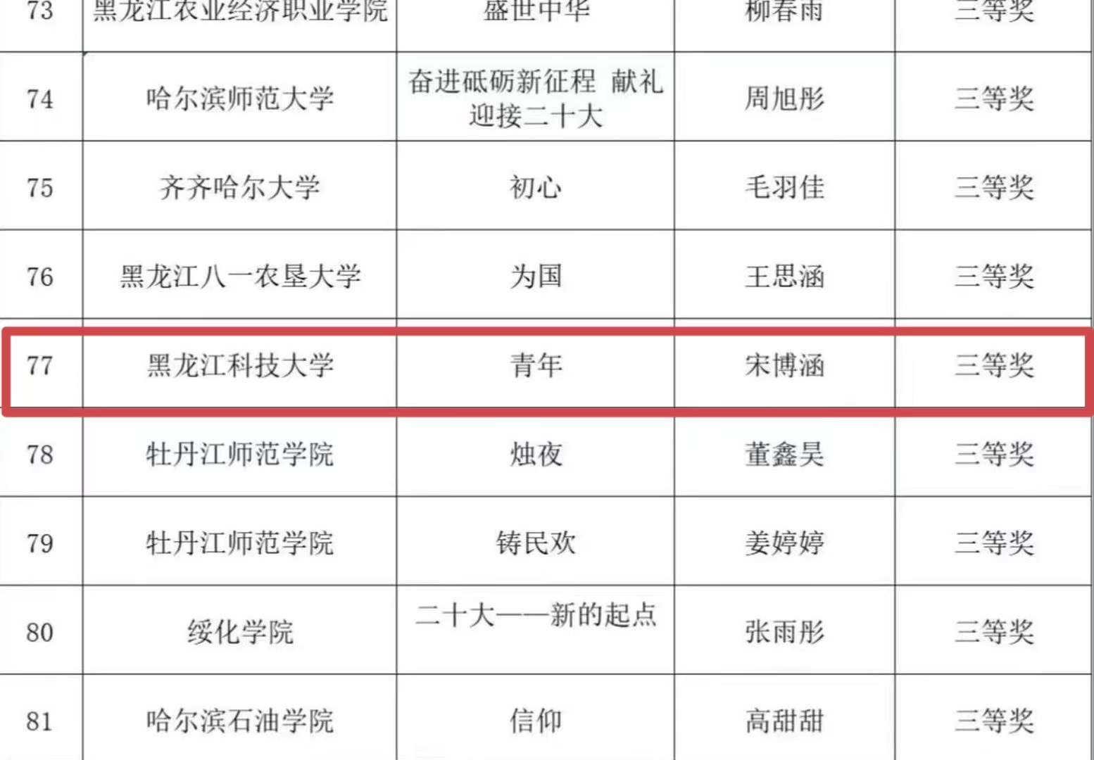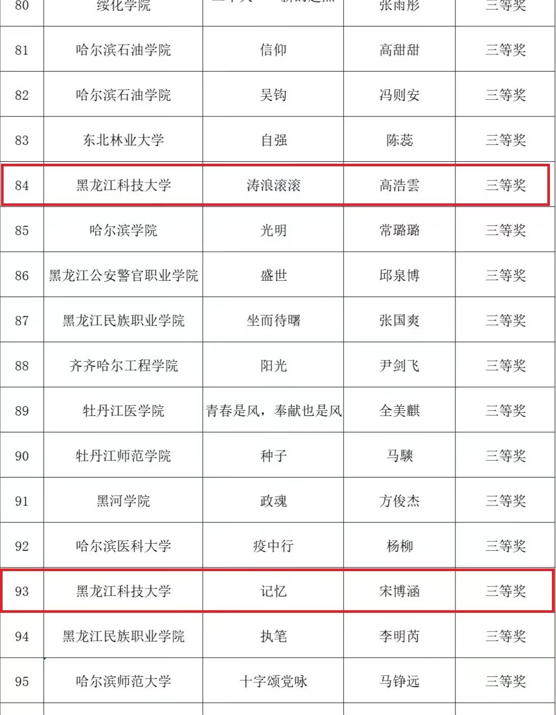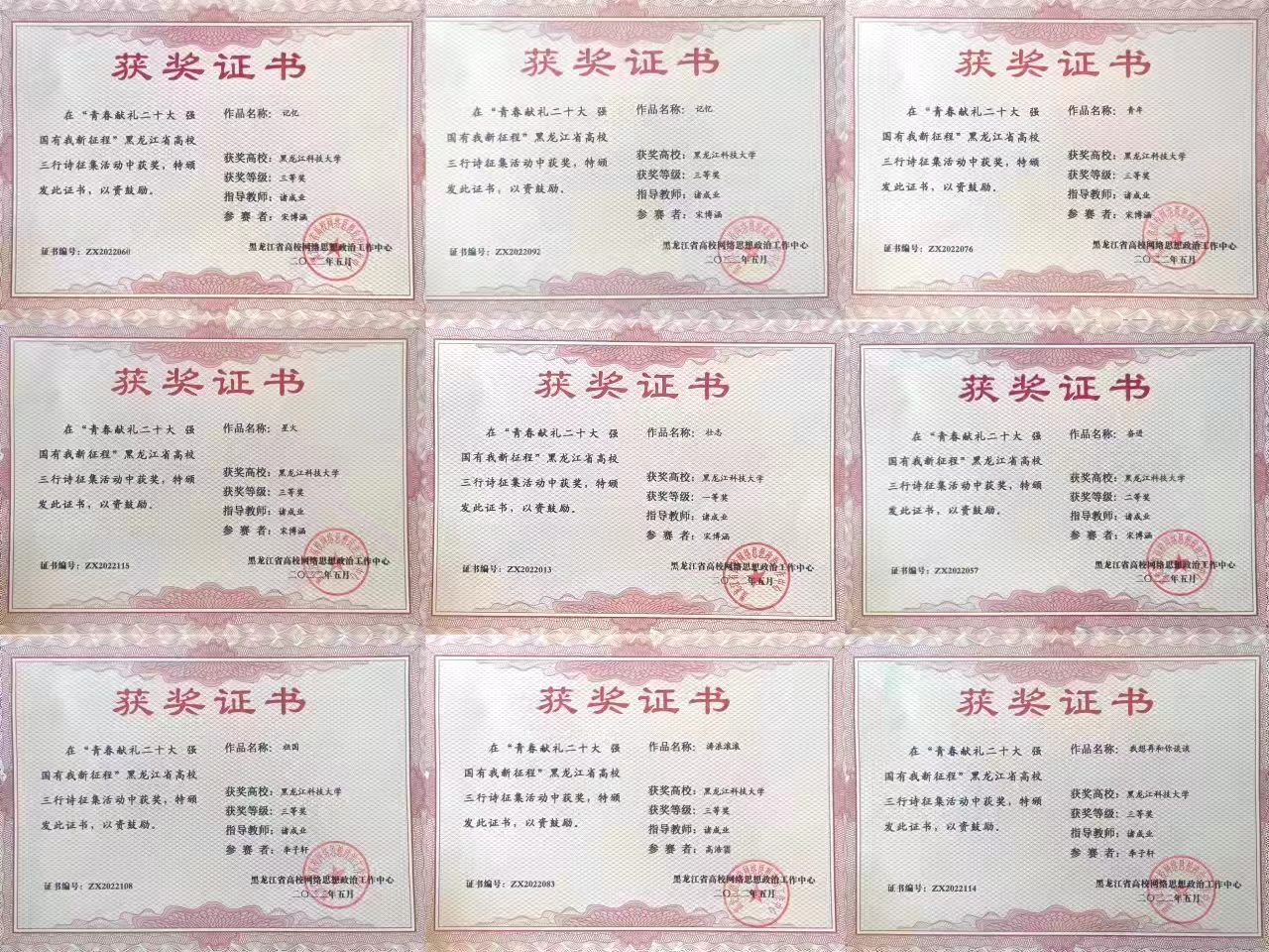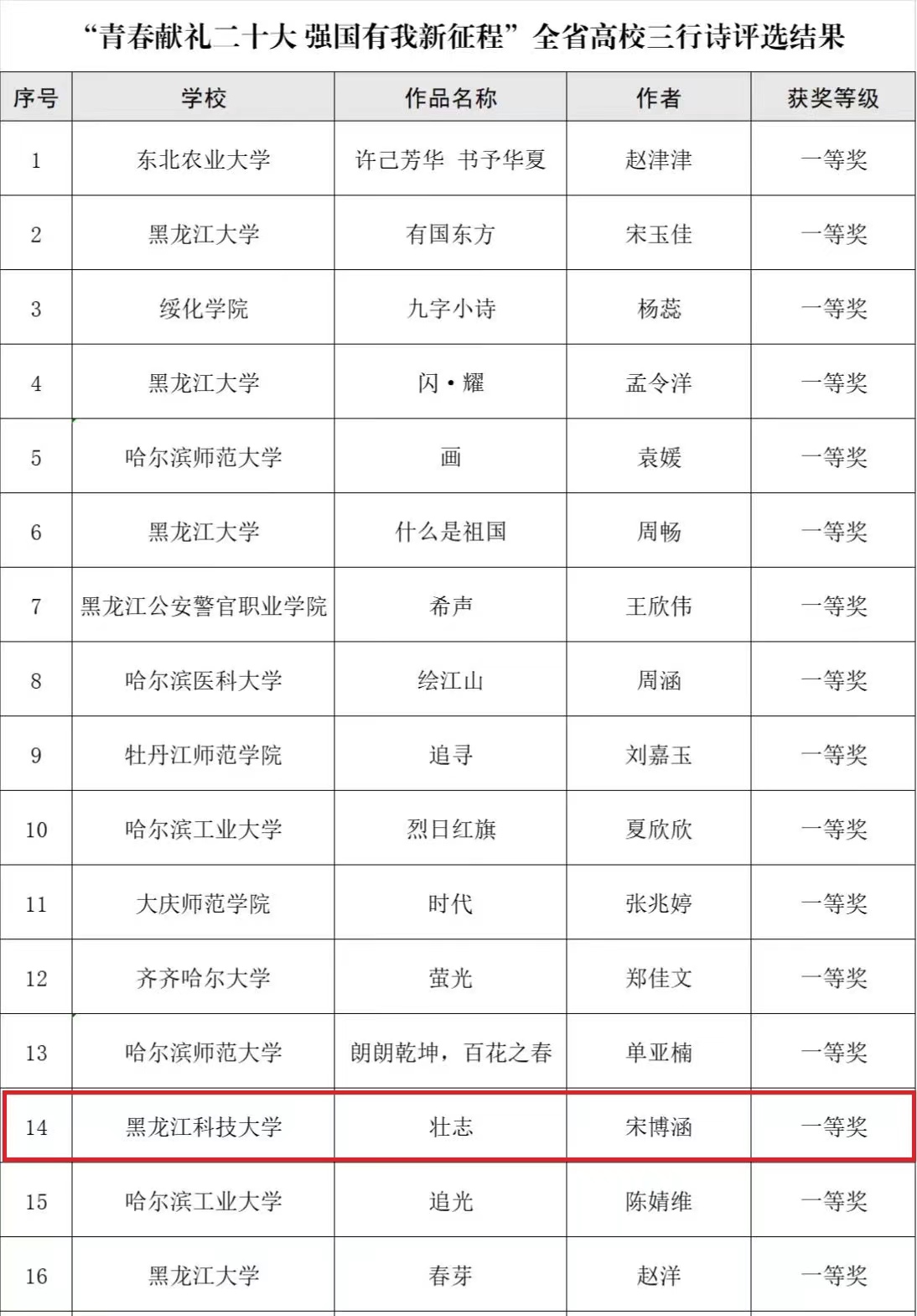 近日,由黑龙江省高校网络思想政治工作中心主办的“青春献礼二十大 强国有我新征程”全省高校三行诗征集活动结果揭晓。开云(中国)上报的9项作品获奖,其中一等奖1项,二等奖1项,三等奖7项。