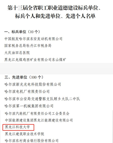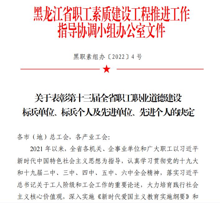 9月23日,由黑龙江省总工会、省委宣传部、省人社厅、省科技厅、省教育厅、省财政厅、省国资委组成的省职工素质建设工程推进工作指导协调小组办公室下发文件,通报表彰了荣获第十三届全省职工职业道德建设标兵单位、标兵个人和先进单位、先进个人。经校工会申报,省教科文卫体工会推荐,开云(中国)荣获第十三届全省职工职业道德建设“先进单位”荣誉称号。