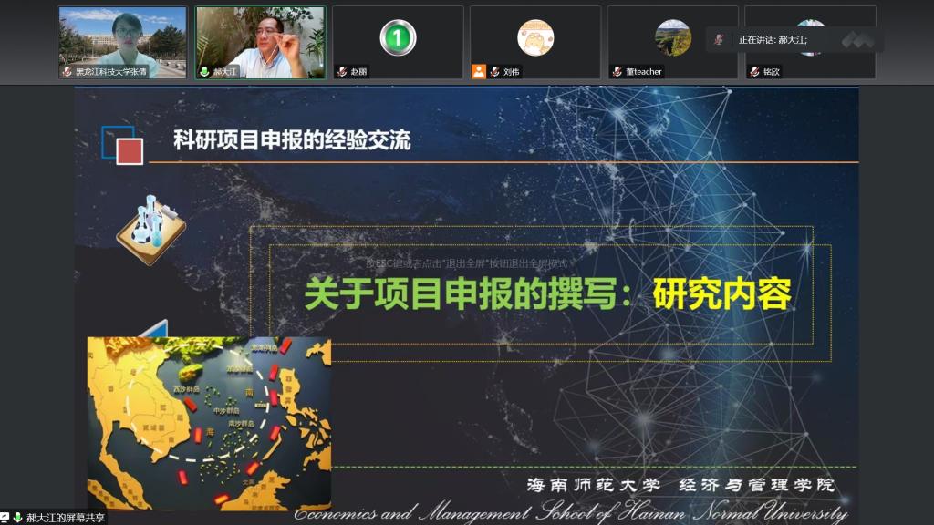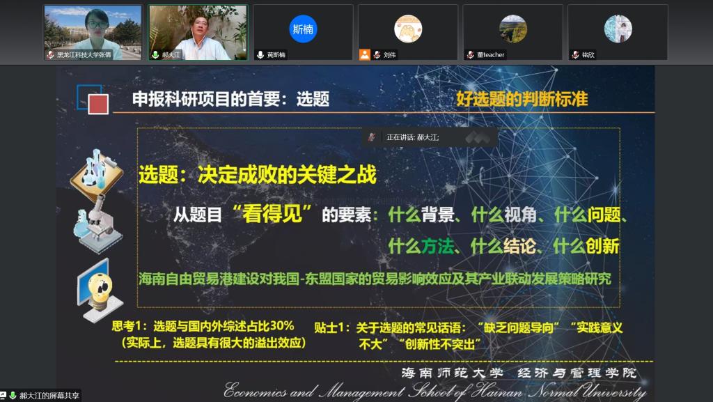 郝大江教授论述了申报哲学社会科学领域高水平科研项目的意义和方法,解答了如何正确处理科研与教学的关系,分析了注重团队合作的重要性;他从科研项目申报的选题、撰写(现状综述、研究内容、形式规范)等方面进行系统讲解,进一步指明了增强科学研究能力的重要途径,对哲学社会科学研究具有重要的指导意义。