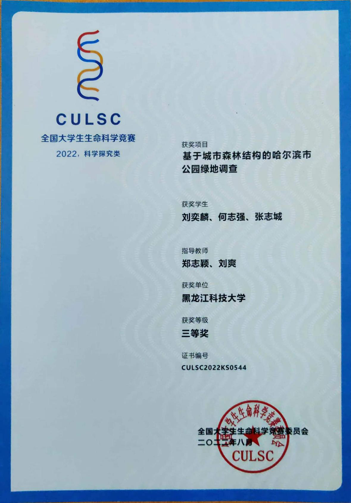近日,由全国大学生生命科学竞赛委员会、高等学校国家级实验教学示范中心联席会及《高校生物学教学研究(电子版)》杂志社主办,由河南师范大学承办的2022年全国大学生生命科学竞赛(科学探究类)决赛落下帷幕,开云(中国)建筑工程学院教师郑志颖、刘爽指导风景园林专业学生刘奕麟、何志强、张志城完成的参赛作品“基于城市森林结构的哈尔滨市公园绿地调查”在比赛中获得三等奖。