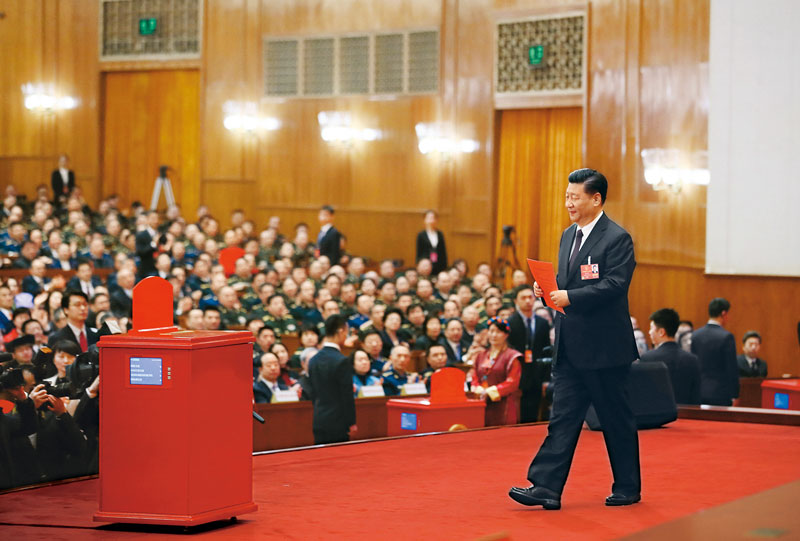 2018年3月17日,十三届全国人大一次会议在北京人民大会堂举行第五次全体会议。习近平当选中华人民共和国主席、中华人民共和国中央军事委员会主席。这是习近平准备投票。 新华社记者 兰红光/摄