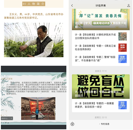 搭建平台颂诚信。一是学院健全网络新媒体环境下诚信教育体系,借助微信公众号平台进行诚信教育普及和引导,营造诚信光荣的健康网络舆论氛围,激发强本领、增见识、讲奉献的内生动力。开展金融知识讲解、防诈骗知识宣传等专题宣传,累计阅读量6000余人次。二是组织学生学习诚信人物吴玉兰、谢延信、陈金英、王乐义等诚信事迹,发挥青年学生诚信典型示范引领作用。三是开展红色故事分享会,践行诚信志愿服务,发掘红色故事中的诚信光芒。用青年的视角,讲述诚信故事,用“小切口”展现“大主题”。