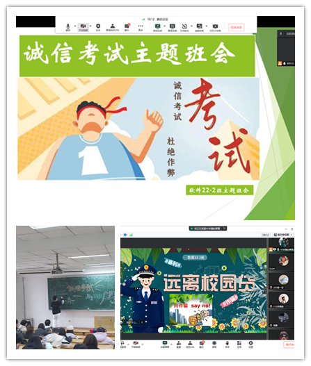 主题班会话诚信。一是各班级通过开展诚信考试主题班会,加强考试违纪警示教育,强化“诚信考试,拒绝作弊”意识,让学生全面了解考试违纪带来的严重后果,潜移默化的涵养学生诚实守信的品质。组织学生签署诚信考试承诺书,进行考前诚信宣讲。帮助学生更好明确了诚信与道德、诚信与个人的成长成才的关系,树立红线意识,守正创新,扬长补短。二是开展家庭经济困难认定“诚信教育”主题班会,引导广大学生了解资助政策和申报流程,恪守诚信自觉如实填报申请材料,强化诚信认知,充分发挥学生自我教育的作用,也让广大学生深刻地认识到诚信感恩的重要性。三是开展防范不良校园贷及电信诈骗教育主题班会。向同学们普及校园网贷和电信诈骗的预防知识,使“拒绝网贷、远离诈骗”深入人心,有利于学生进一步树立正确的消费观念,增强金融安全意识和提升防电信诈骗的能力。