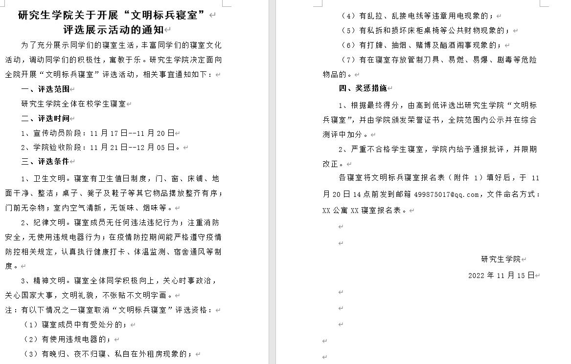 11月17日至12月5日,研究生学院开展“文明标兵寝室”评选展示活动,鼓励全体研究生,创优争先,以先进带动后进,以优秀影响整体,从而保证寒假前研究生寝室的安全稳定。