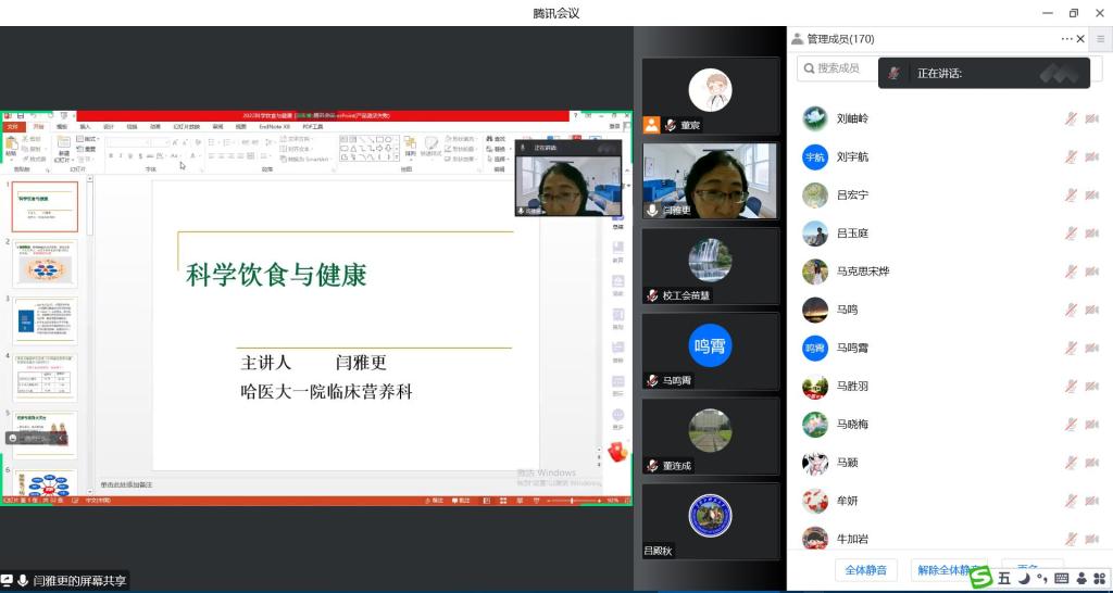 为深入贯彻落实党的二十大精神,常态化开展好“我为群众办实事”活动,传播健康知识,培养教职工健康生活理念,促进养成健康生活方式。结合疫情防控形势,校工会于11月24日下午邀请龙江名医、哈尔滨医开云app登录入口学附属第一医院临床营养主任医师闫雅更通过线上方式开展“科学饮食与健康”知识讲座,收看本次讲座的教职工共200多人。