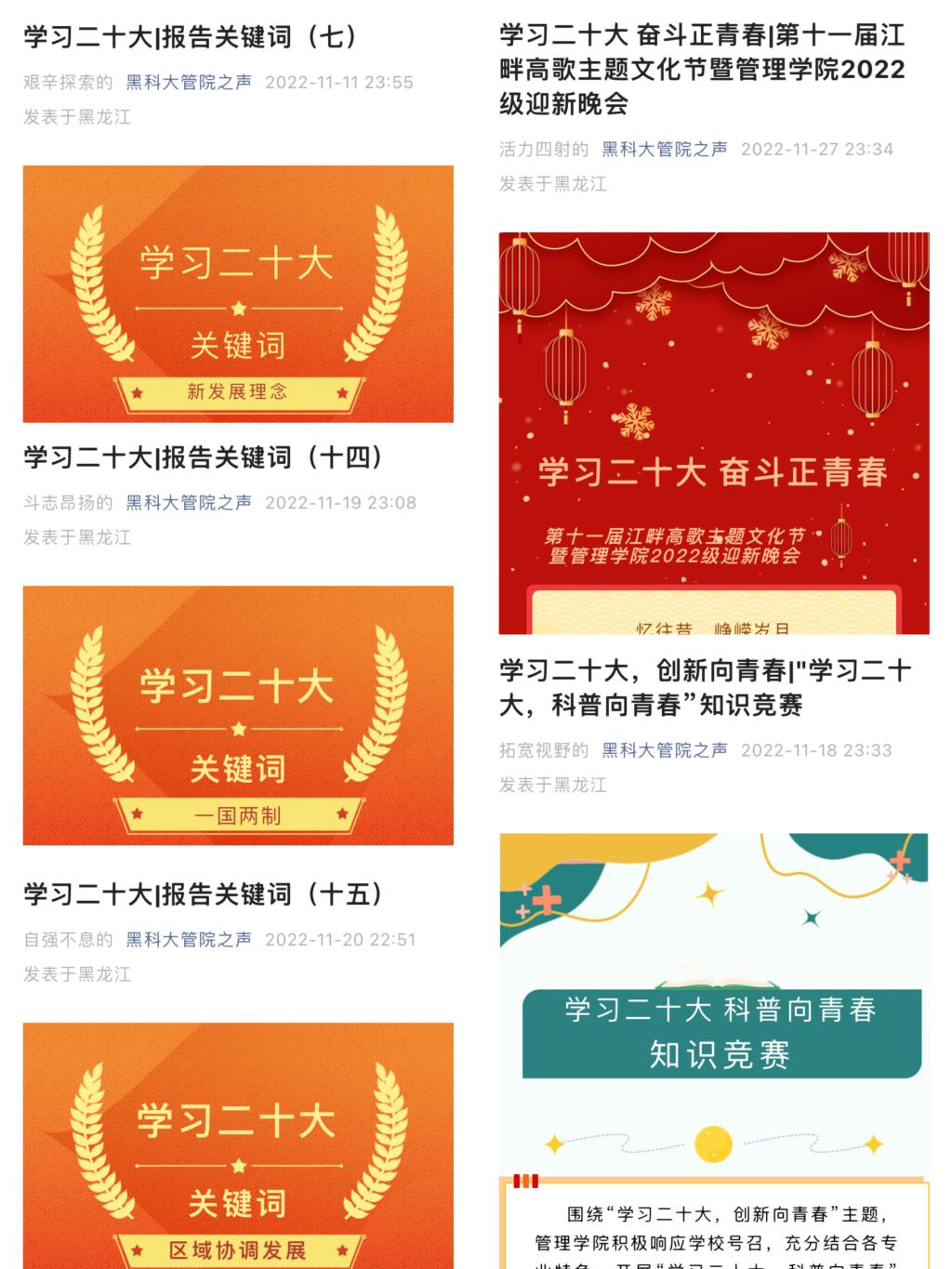 学习贯彻二十大,踔厉奋发新征程。管理学院广泛组织团员青年开展党的二十大精神学习,推进学习走心、走实、走深。通过举办“学习二十大、永远跟党走、奋进新征程”主题云团课学习研讨会;官方公众号管院之声,通过知识问答、知识链接等方式,推送党的二十大报告相关学习内容;动员广大青年学生利用“学习强国”“共青团中央”“青年大学习”等网络平台,积极参与网络专题学习,以更具参与感、互动性的学习形式深化理论自觉。