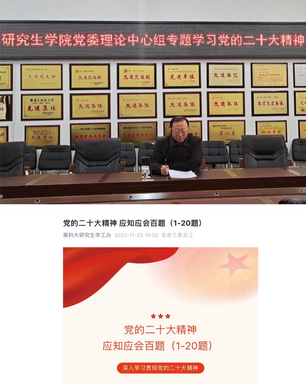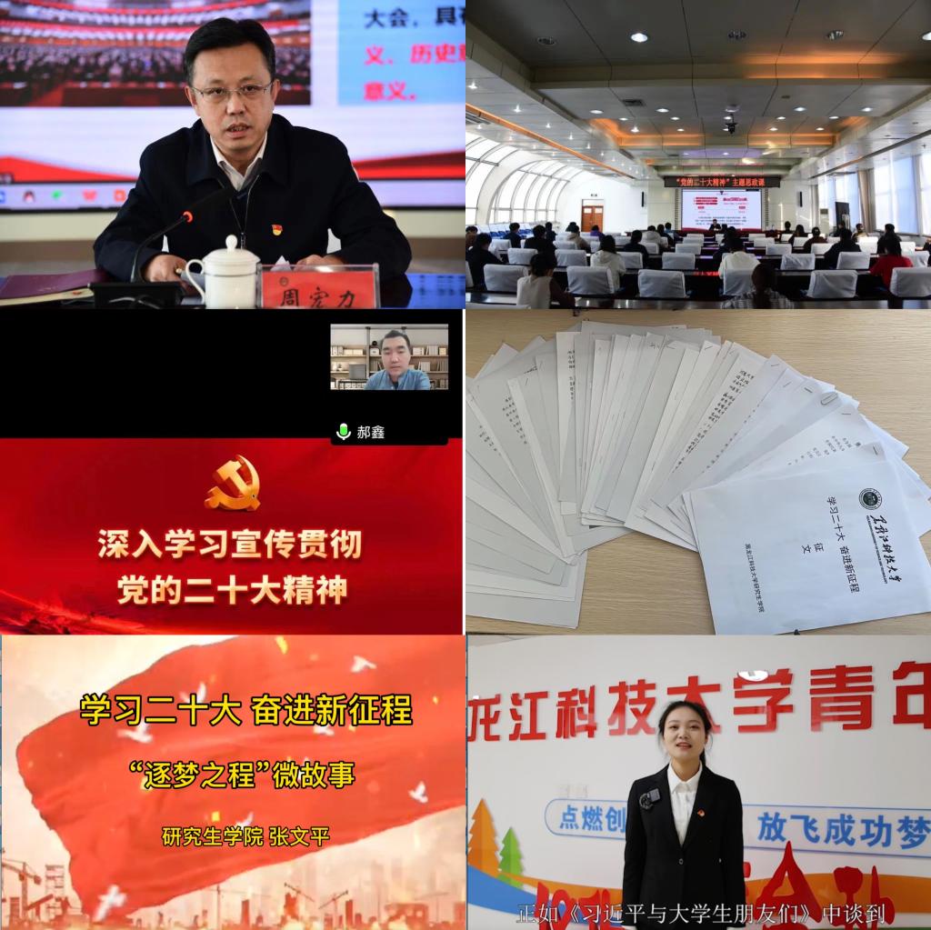 为深入学习宣传贯彻党的二十大精神,掀起学习热潮,聚焦学校《关于开展学习贯彻党的二十大精神“十个一”系列学习教育培训活动的通知》的要求,研究生学院高度重视、精心谋划,结合学院实际,在全体师生及各级党团学组织中开展学习宣传贯彻党的二十大精神的系列活动,引领激励广大青年踔厉奋发、勇毅前行。