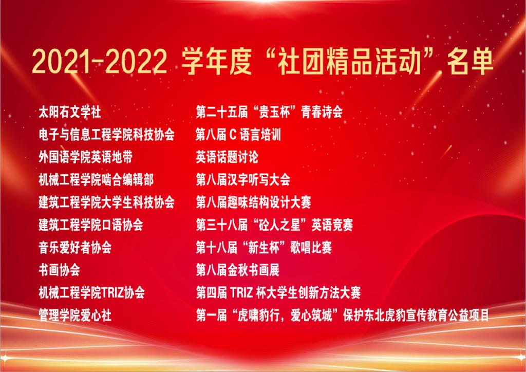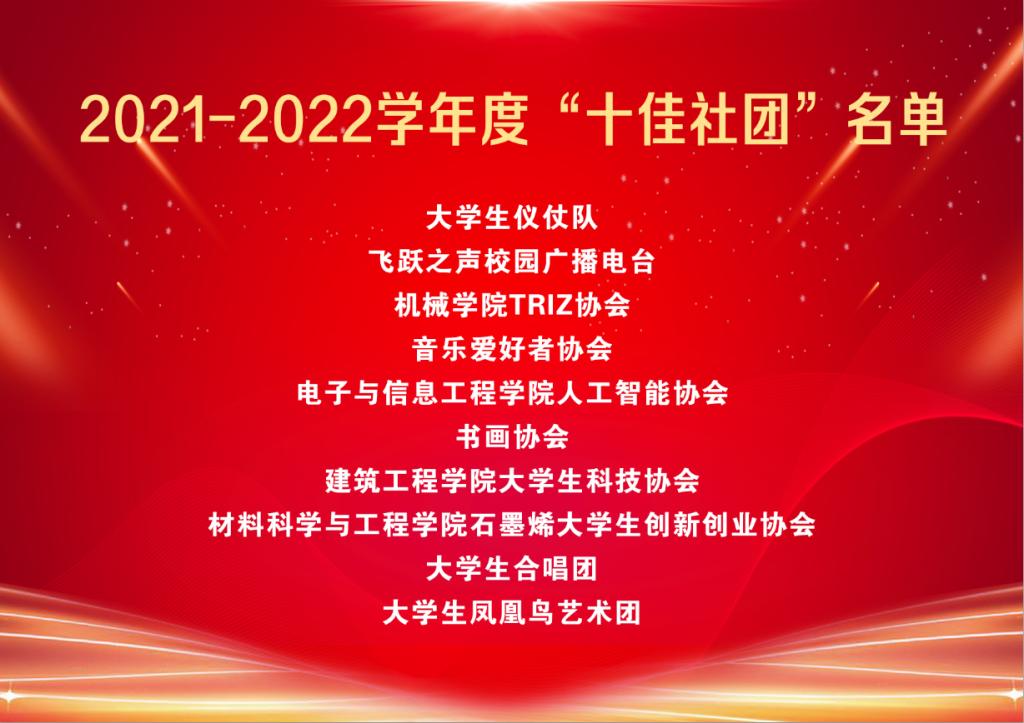 本次评选活动流程规范,程序严谨,特别是在“十佳社团”申报中,吸引了涵盖学术科创、公益志愿、文化艺术等多个类别的22个学生社团申报,经过初审共有15个学生社团进入答辩环节。在答辩中,各学生社团通过PPT展示进行线上答辩,立足思想引领、组织架构、精品活动、未来展望等方面,全面展示了学生社团的风采。最终,石墨烯大学生创新创业协会等10个社团荣获“十佳社团”荣誉称号;建筑工程学院土木20-3班蒋睿等20名同学荣获“社团之星”荣誉称号;机械工程学院机械21-4班肖传友等60名同学荣获“社团活动先进个人”荣誉称号;第二十五届“贵玉杯”青春诗会等10个活动荣获“学生社团精品活动”荣誉称号。