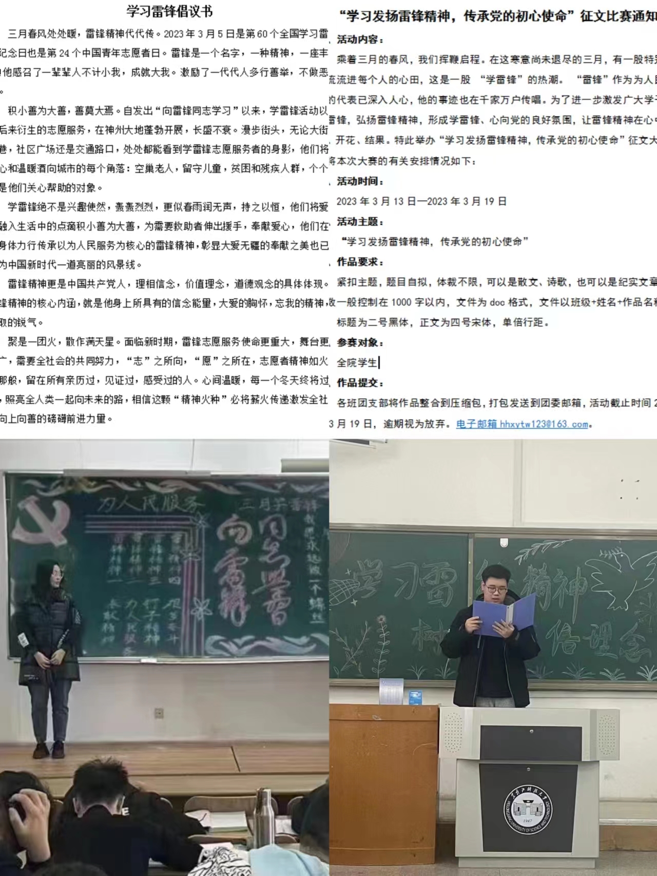 青年思,雷锋精神我传承。为营造学习雷锋精神良好氛围,掀起“学雷锋”热潮,学院组织全体青年学生开展“学习发扬雷锋精神,传承党的初心使命”征文比赛,将雷锋精神、志愿精神烙印广大青年学子心中,用文字传递精神力量,号召学生争做新时代雷锋精神的传承者。