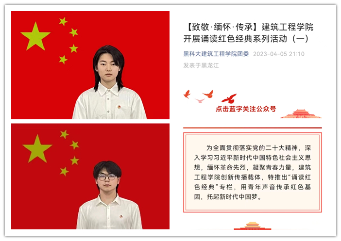 开展“诵读红色经典 传承红色精神”活动。学院创新传播载体,推出“诵读红色经典”、“致敬·缅怀·传承”专题栏目,遴选出优秀青年学子代表进行音频录制,抑扬顿挫、饱含深情的诵读声凝聚着青年学子炽热的家国情怀,讴歌英雄们的丰功伟绩,唱响红色主旋律,用青年声音传承红色基因,托起新时代中国梦。
