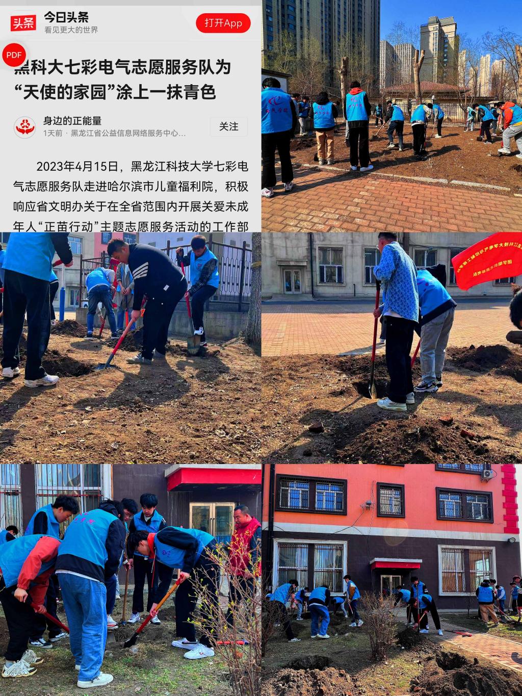 为积极响应省文明办关于在全省范围内开展“正苗行动”主题志愿服务活动的工作部署,把学习宣传贯彻党的二十大精神与关爱未成年人主题志愿服务活动结合起来,切实发挥新时代青年志愿者将爱心和善意、责任与担当传递给困境儿童的作用。4月15日电气学院七彩志愿服务队在省志愿服务发展中心的指导下,赴哈尔滨市儿童福利院开展“正苗行动 绿色陪伴”主题义务植树活动,“今日头条”平台进行了相关内容的报道。