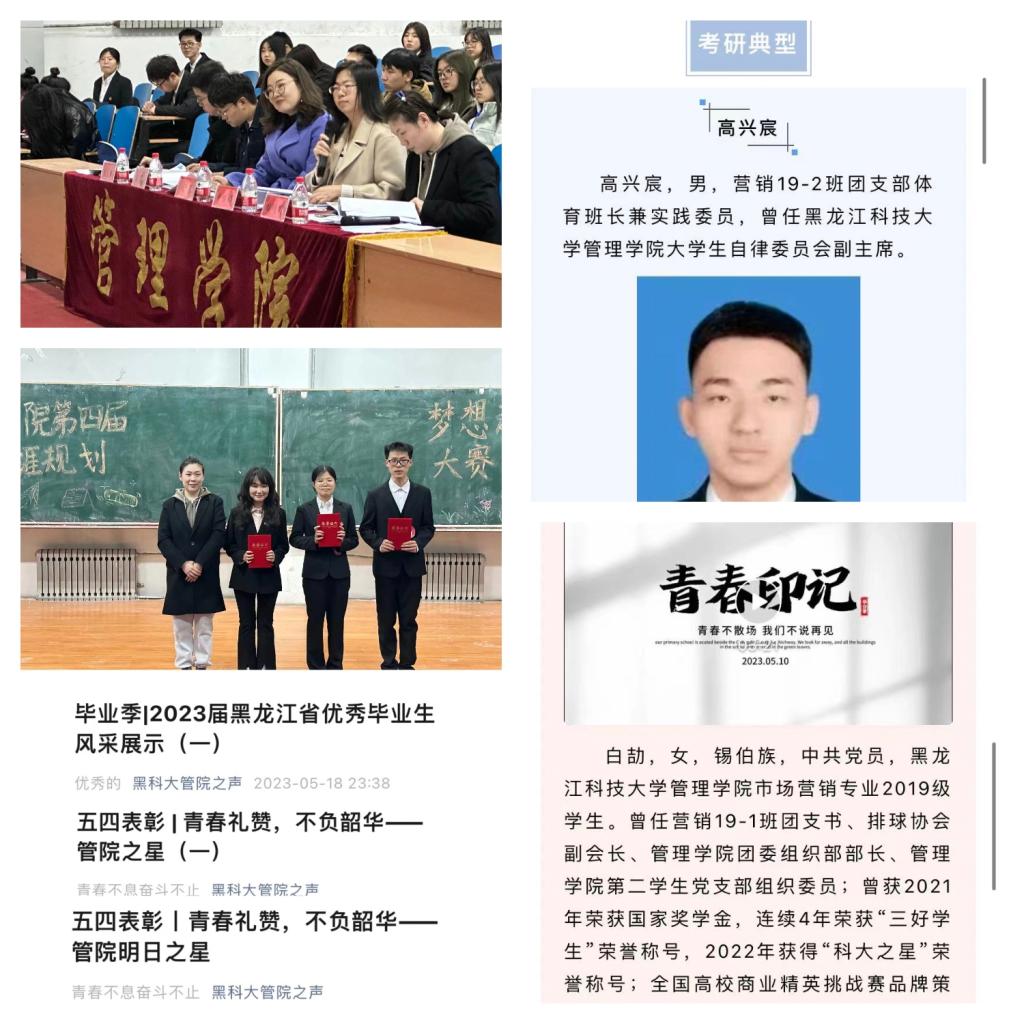 以终身学习教育为目标,激发学生的主动学习自觉。为教育引导学生结合专业制定人生规划和目标,举办第四届“梦想启航”职业生涯规划大赛,增进大学生的职业生涯规划意识;深入开展励志成才教育,选树一批保研、考研和就业先进典型进行经验分享,组织开展“管院之星”评选,通过“管院之声”微信公众号对学风建设先进集体和奖学金获得者先进事迹宣传,旨在努力营造管院向上的学习风气,切实有效推动学风建设。