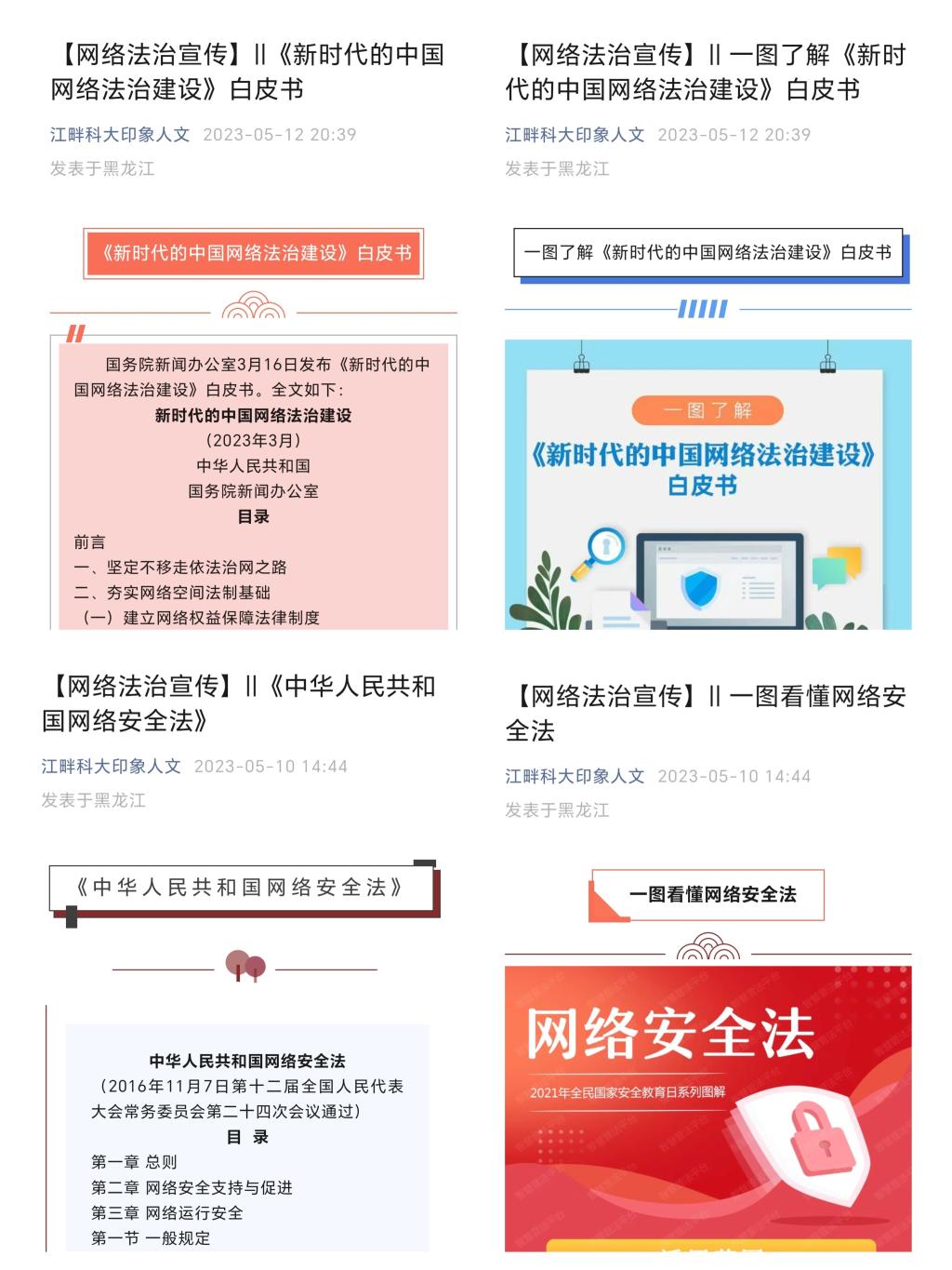 普法脚步不停歇,法治宣传在身边。开展网络法治宣传活动,组织学生学习《中华人民共和国网络安全法》、《新时代的中国网络法治建设》白皮书,使学生明白在网络安全上,人人皆是主角,捍卫网络安全和净化网络生态不仅是国家大事,更是每一个公民义不容辞的责任。
