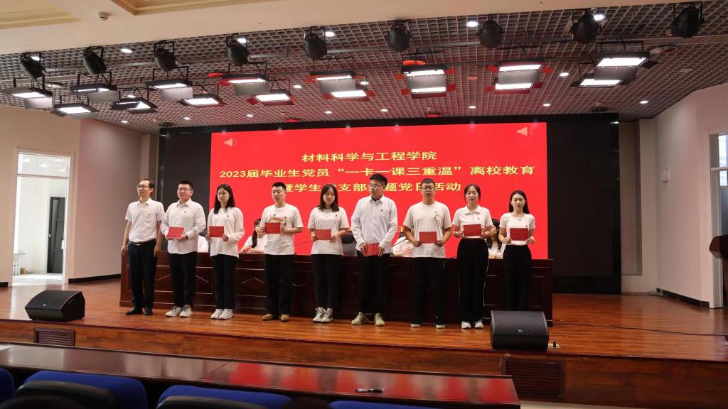 为深入贯彻落实习近平新时代中国特色社会主义思想,教育引导毕业生党员坚定理想信念,秉承“厚德博学、强吾兴邦”的校训,弘扬“自强不息、创业创新”的办学精神,材料学院于6月16日开展了“一卡一课三重温”主题党日暨离校教育活动。学院党委副书记孙亚朋、全体辅导员和2023届毕业生党员参加了活动,活动由学工办主任李伟主持。