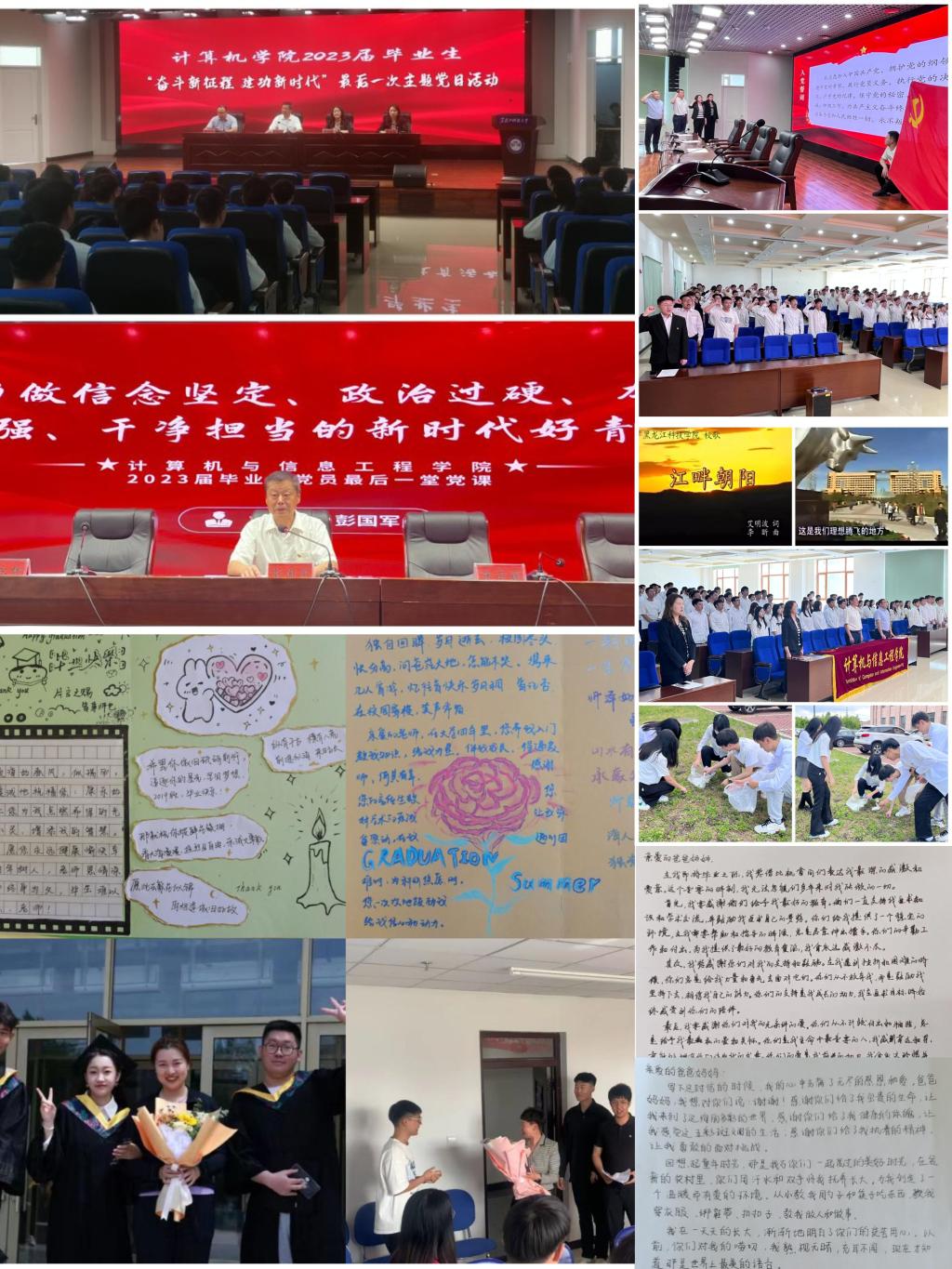 “四场活动”表达浓浓感恩心。一是6月2日开展“奋斗新征程 建功新时代”2023届毕业生党员最后一次主题党日活动,学院党委书记彭国军以《努力做信念坚定、政治过硬、本领高强、干净担当的新时代好青年》为主题为毕业生党员讲授最后一堂党课,组织全体毕业生党员开展净化校园志愿服务,为毕业生党员踏上新征程、走好人生路、牢筑信念之基。二是6月14日,开展2023届毕业生党员“三重温”主题教育活动,通过重温入党誓词、重温入党申请书、重温入党谈话活动,进一步坚定了毕业生党员的理想信念;三是通过一个拥抱、一张贺卡、一句祝福、一支鲜花的形式真诚地向恩师、母校道谢,深情表达对恩师和母校的感谢和留恋;四是开展“一封家书”感恩父母活动,道出了对父母满怀感恩的话语,诉说了大学四年的成长历程及个人收获,传递到父母的心底。