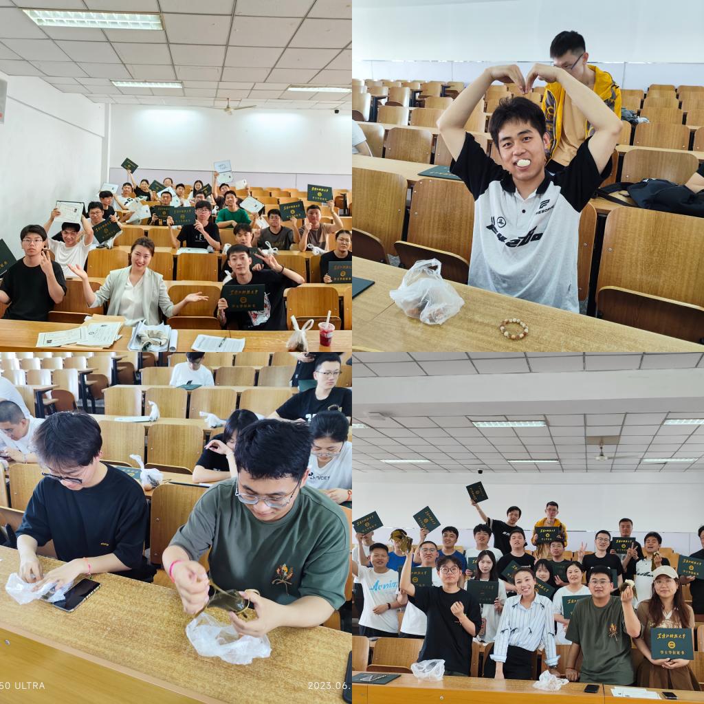 “青春不散场,聚散‘粽’有情”。毕业典礼当天,学院为全体毕业生送上了一份“端午饮食礼”,包含一个“甜蜜幸福粽”、一颗“红色幸运蛋”、一根“五彩安康绳”。当毕业季遇上端午节,“幸福粽”是情谊,“幸运蛋”是祝愿,“安康绳”送福吉,学院师长们用最朴实的方式向广大毕业生们送上最真挚的祝福,同学们满脸的喜悦和兴奋感受着母院家一般的温暖;在“最后一次团活”上,班主任为大家系好五彩绳,一同吃粽子、画彩蛋,彼此送上最诚挚的祝愿,离别之际,老师们希望广大毕业生在未来的道路上前程似锦,坚定不移听党话,跟党走,牢记“厚德博学、强吾兴邦”校训,增强报效祖国,感恩母校的责任感与归属感,争做时代前列的奋进者、开拓者、奉献者。