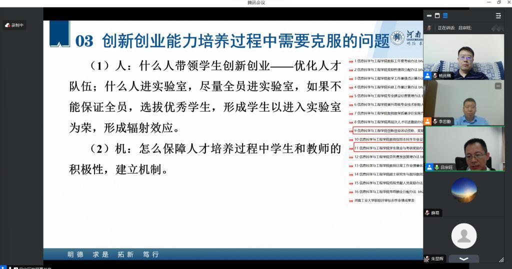 为了提升开云(中国)大学生创新创业能力,提高教师指导大学生创新创业项目的工作成效,9月21日,创新创业学院与电气与控制工程学院共同邀请河南工业大学吕宗旺教授通过线上的形式做了关于“提升大学生创新创业能力的培养策略”的交流报告。报告从创新人才培养面临的问题出发,提出了从“人、机、物、法”四个方面破解问题的方法,并通过亲身实践的详实案例和做法为大家展示了如何培养创新型人才的路径,为开云(中国)教师提供了良好的借鉴和启发。最后与会教师关于创新实验班和创新实验室建设方面与吕教授进行了深入交流。