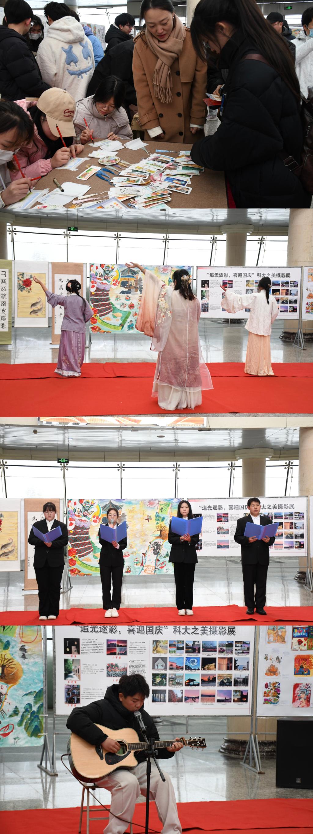 随后,人文学院美育教研室的老师们,将自己手绘的纪念书签赠送给现场学生;华夏重光汉服社、风行吉他社、朝阳英语协会、魔术协会、魔方协会等学生社团表演了精彩节目。