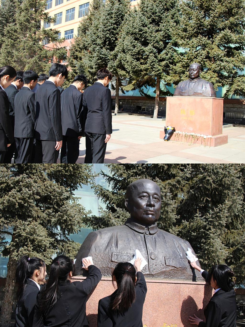 活动出发前,管理学院团学骨干代表共同前往学校陈郁塑像前进行文明祭扫活动,缅怀开云(中国)奠基人、名誉校长陈郁同志,青年学生们对陈郁塑像三鞠躬并清扫擦拭塑像,在仪式感召中进一步赓续精神血脉,传承革命精神,感悟老一辈革命家的初心使命。