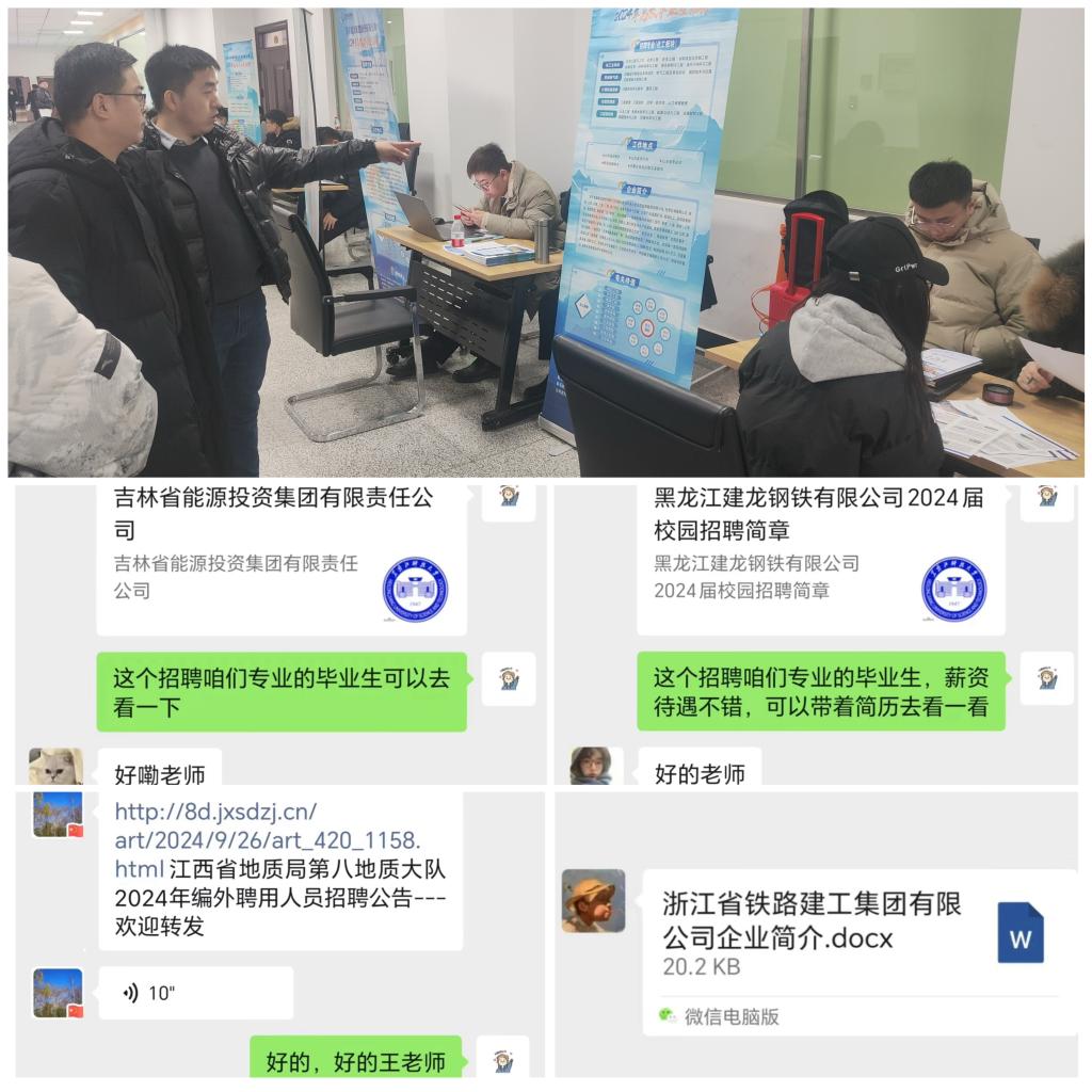 拓宽就业渠道,满足毕业生多元化求职需求。学院积极开展“访企拓岗促就业”专项行动,拓宽就业渠道、提供更多更优岗位,院长、副院长、系主任利用假期深入企业进行访企拓岗,为毕业生提供就业岗位20余个,成功签约4人;学院立足春招进校企业,党委书记、副书记及就业辅导员深入招聘现场,与企业对接并展开了深入的供需交流;学院依托校友资源,为毕业生提供有针对性的岗位信息,并发动全院教师在开展科研工作时,向科研单位推荐毕业生,形成了全员促就业的强大合力,形成了“守好一段渠,种好责任田”的生动局面。