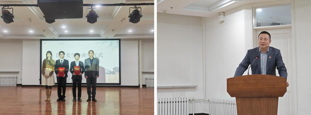 年级辅导员戴劲、迟文玉为机械22-1班刘泽有、机械20-4班程训聪颁发了2022-2023学年度国家奖学金证书。