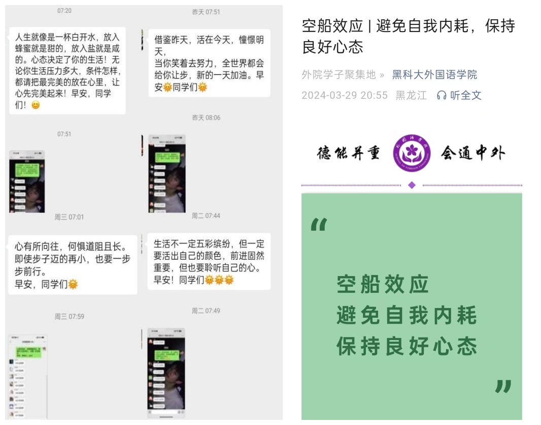 持续不断靠恒心。外国语学院通过定期在公众号内发布心理科普知识,班级心理负责人每日在群内发送早安语等形式,提高学生的心理健康知识水平,增强学生的心理保健意识,优化学生心理素质,掀起关注心理健康的热潮,真正让心理教育工作走深走实。