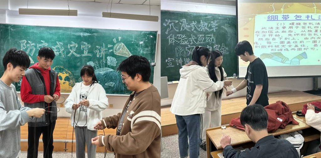 四是在体验式互动中提升应急避险能力。设置心肺复苏、绳结与包扎演练互动体验区,同学们模拟心肺复苏,学习单结、双平结等常见绳结方法及伤口包扎技能,了解这些应急场景中的具体应用。让学生们从“观、感、练”的多重体验中,在沉浸式教学、体验式互动中,学习应急安全知识、提升应急避险能力。