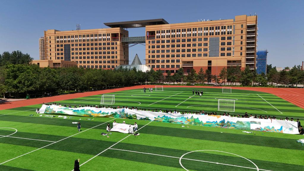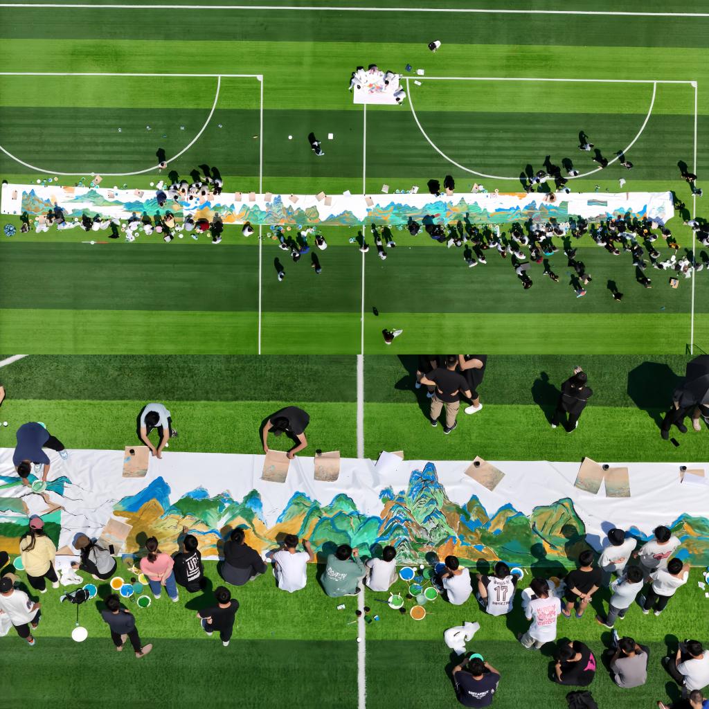 《千里江山图》是北宋王希孟创作的绢本设色画,现收藏于北京故宫博物院。此画“气象磅礴,吞吐山河,堪称宋朝版《航拍中国》”,是中国青绿山水画的巅峰之作。300多名没有绘画基础的学生,在老师们的耐心指导下,凭借着丰富的想象力和创造力,共同描摹出了这幅经典作品的轮廓,架起了一座连接自然美景与传统文化和人文精神的桥梁。这幅长42米、宽2米的开云app登录入口版《千里江山图》的成功绘制,实现了一次穿越千年的、古今的对望,而这一片跨越了历史长河、连接着过去未来、充满了生机和朝气的壮丽河山,是2023级学生送给2024届6200余名毕业生最美好的祝福,祝愿他们眼有星辰大海,胸有丘壑万千,心有繁花似锦,共赴美好未来!