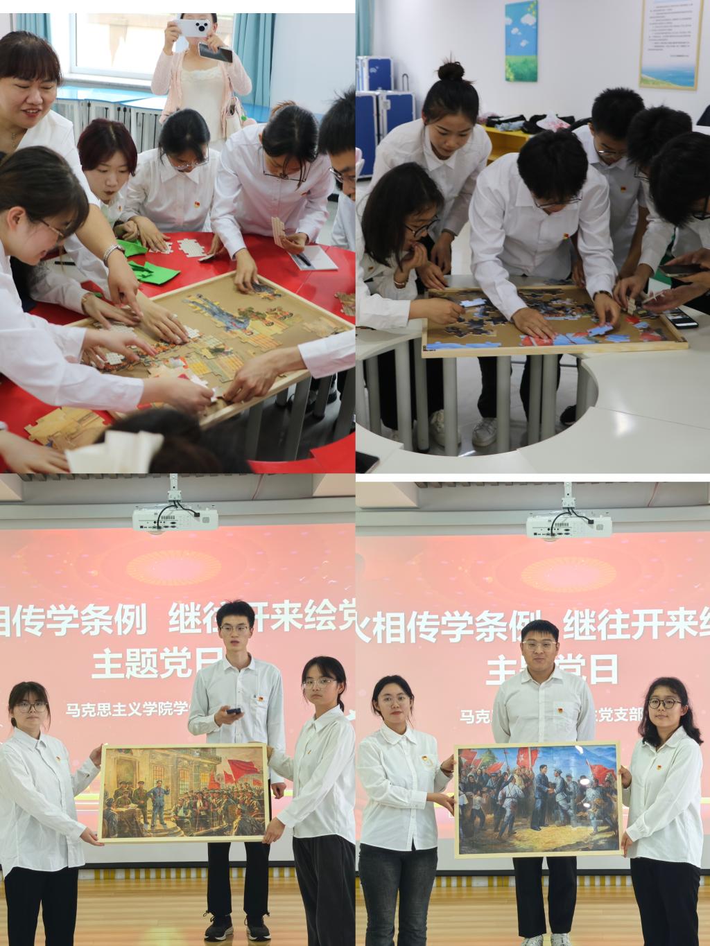 活动以支部为单位分为两个队伍进行答题比拼,每答对一题获得一份拼图碎片,率先完成拼图的支部获得胜利。竞赛以《中国共产党纪律处分条例》内容为题,采取抢答的形式,设选择题、判断题两种题型,抢答并回答正确的队伍获得一组拼图碎片。学生党员参与热情高涨,踊跃举手抢答,活动气氛热烈,通过支部成员的团结一心、分工合作,学生第一党支部率先完成“南昌起义”拼图,学生第二党支部紧随其后完成“井冈山会师”拼图。每个支部选取学生党员代表讲述各自拼图背后的党史故事,两幅拼图所展现出的是党的峥嵘岁月、是承载党不屈不挠的斗争精神、是对革命道路不断探索。