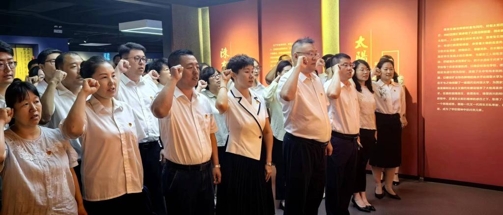 会后,管理学院领导班子成员及全体教师党员赴校史馆组织开展了“学习党纪 勇担使命”庆祝建党103周年主题党日活动。在校史馆宣誓厅,全体党员肃立在鲜红的党旗前,庄重地举起右拳,重温入党誓词,铿锵有力的誓言再次表达对党的无限忠诚和投身教育事业的坚定决心。