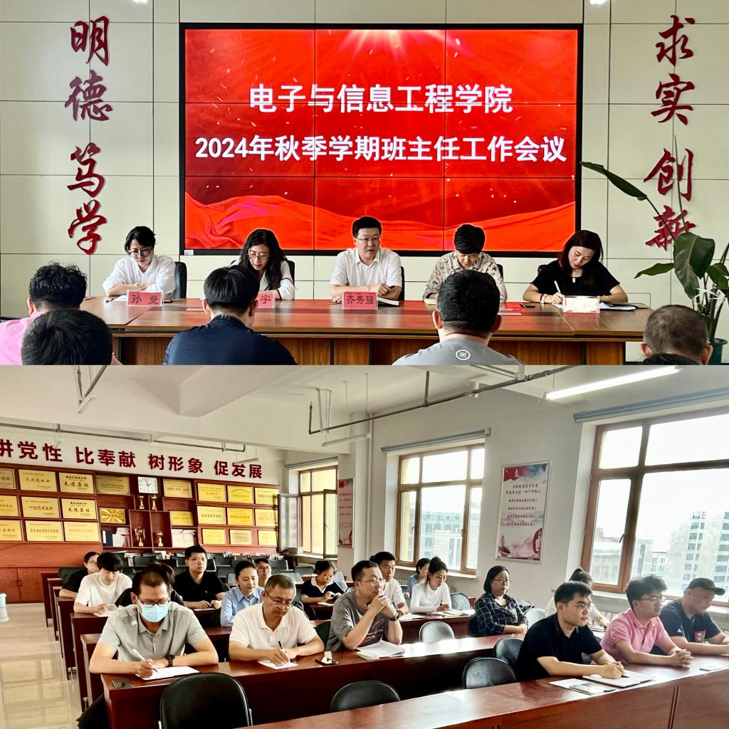 为进一步加强班主任队伍建设,提升班主任核心素养,充分发挥班主任在学生思想政治教育、学风建设、日常管理等方面的重要作用,引导学生德智体美劳全面发展,更好的服务学校新一轮本科教育教学审核评估工作,8月26日,电子与信息工程学院在朝阳楼0809会议室召开2024年秋季学期班主任工作会议。党委书记齐秀强、党委副书记吕平出席会议,全体辅导员、班主任参加会议,会议由学工办负责人陆冠楠主持。