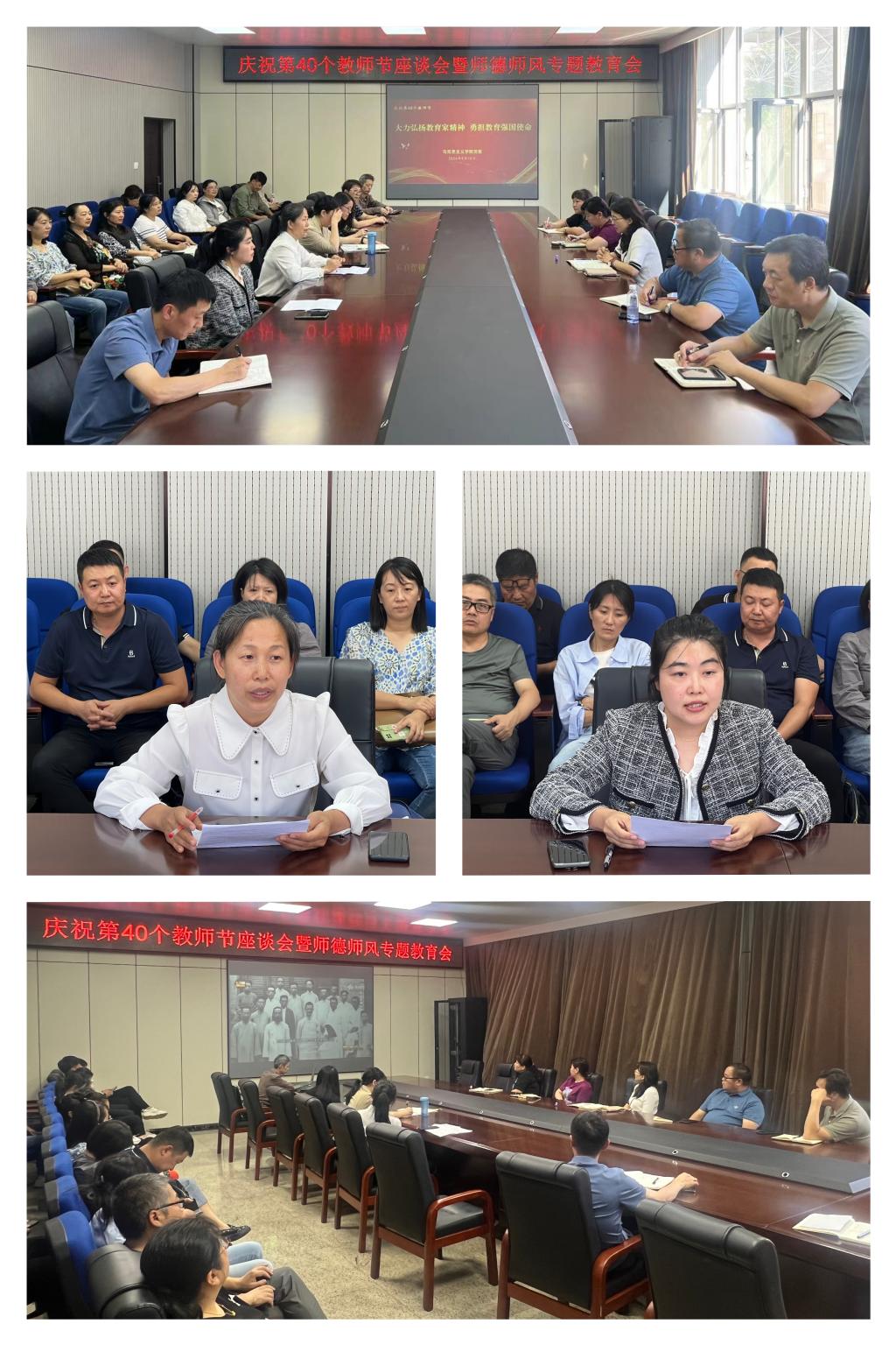 本次座谈会以“大力弘扬教育家精神 勇担教育强国使命”为主题,集中学习了习近平总书记关于教育家精神的重要论述,传达了学校庆祝第40个教师节暨科技工作会议精神,共同观看了央视CCTV-4制作的《教育家精神》系列专题片之“心有大我 至诚报国”。骨干教师代表、德法教研室教师付金凤教授,阐发了对教育家精神的深刻理解,分享了自己从教二十多年来的感悟与经验,鼓励大家要始终牢记思政课教师的职责使命,落实好“六要”要求,争做新时代“四有”好老师。新入职的青年教师代表王晨璐老师表达了对学校和学院的感谢,表示将大力弘扬教育家精神,积极向身边榜样学习,不断提升自己的教学科研能力,努力为教育强国贡献力量。