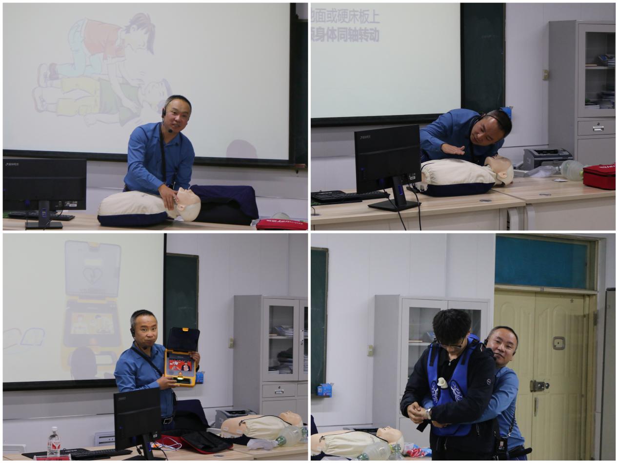 培训中,闫峰采用理论知识讲解和救护技能实操相结合的方式,就应急救护的原则、心肺复苏的具体操作及AED除颤仪的使用方法、气道异物梗阻的处理方法(海姆立克急救法)等进行了细致讲解,帮助大家明确当应急事件发生时,如何第一时间采取有效处理。