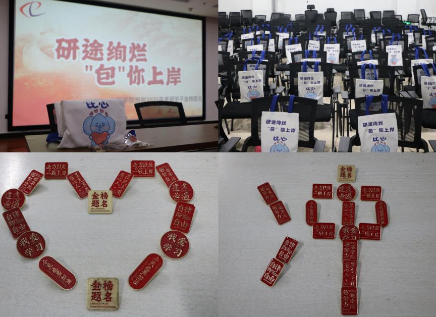 活动中,李鹏银充分肯定了考研学子四年来取得的成绩与进步,亲切地询问了复习情况以及考试心态,叮嘱同学们保持积极乐观的态度,合理安排复习时间。苏勋文向同学们讲述了当前的考研趋势、竞争形式、考试政策,从专业的角度提出考研过程中常见的问题与解决策略。侯树成从信心、坚持和方法等方面鼓励同学们坚定信念,在最后冲刺阶段要锚定目标不要气馁、不畏艰难、不惧挑战。全体辅导员代表学院为考研学子送上暖心礼包,“定制加油包”,蕴藏着学院全体师生最诚挚的祝福,“励志胸针”为考研学子提供心理能量,“未来可期笔记本”寓意用青春书写人生答卷,“彩虹糖果”代表用绚丽的味道给予鼓励,“功能饮料”为考研学子补充能量,祝福每位考生金榜题名,上岸成功。