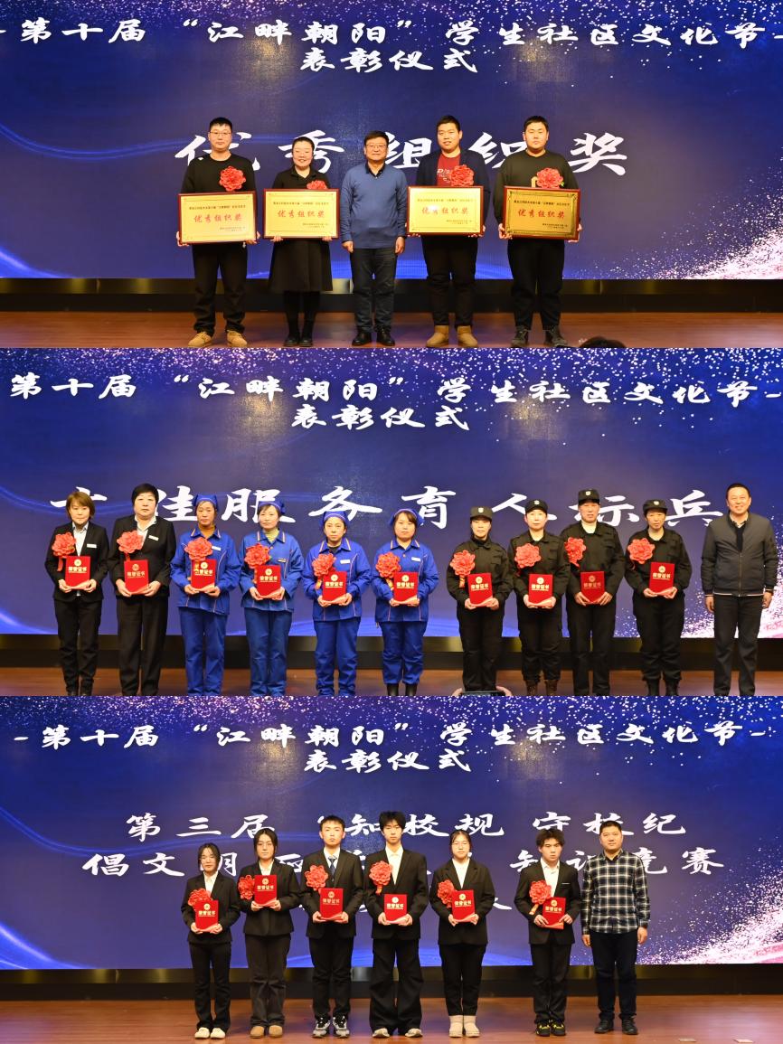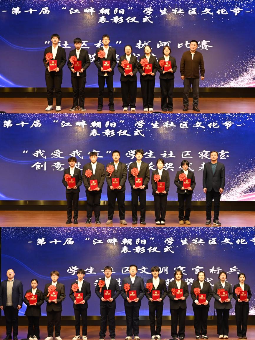 “我爱我家”寝室风采大赛过后,进行了第十届“江畔朝阳”学生社区文化节闭幕式表彰,学生社区创意大赛、“社区杯”拔河比赛、“知校规 守校纪 倡文明 正学风”知识竞赛的获奖代表、文明寝室标兵、先进个人、服务育人标兵及获得优秀组织奖的单位和个人受到表彰。