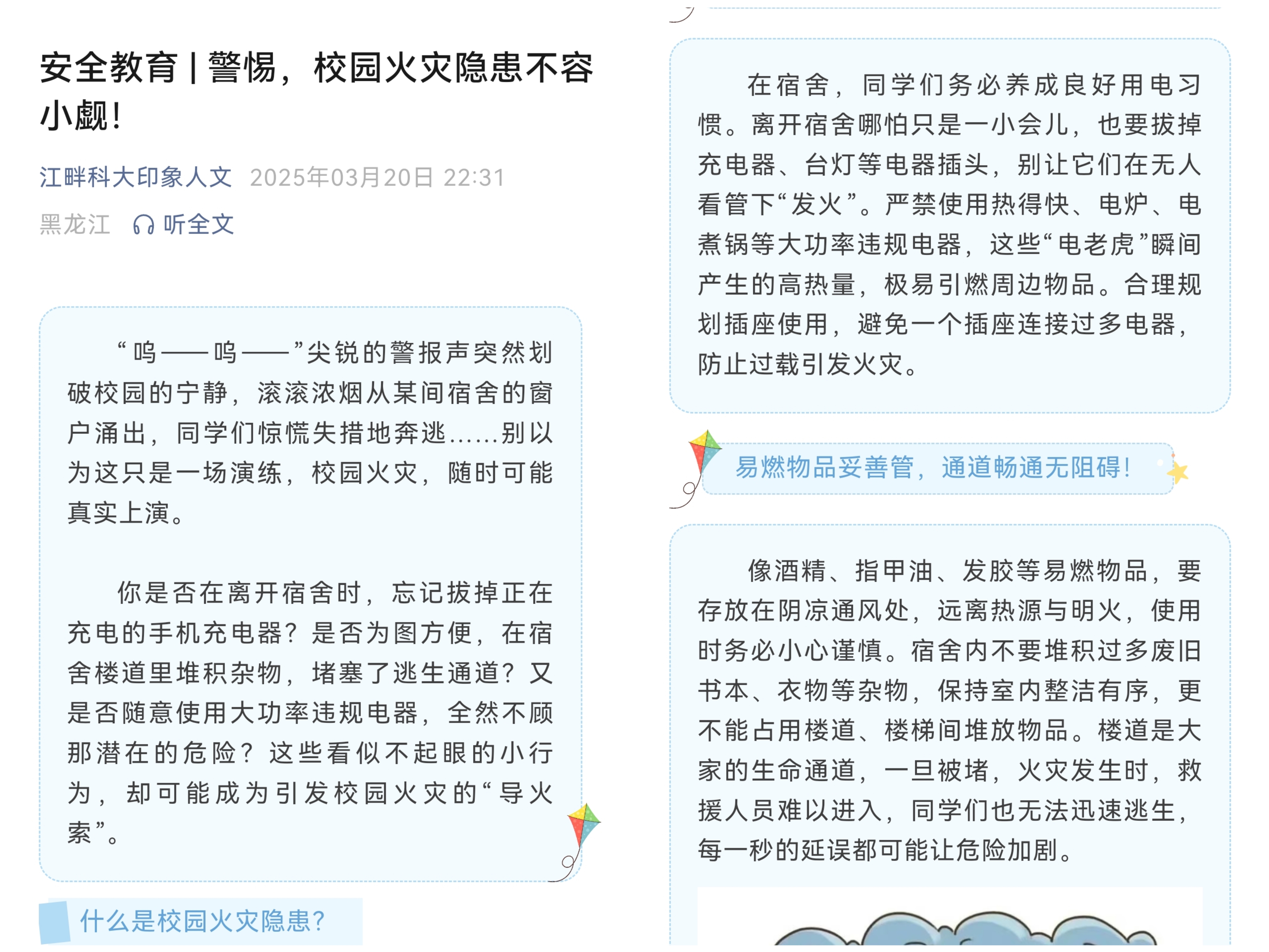 加强思想教育,公众号推送助力安全宣传。在强化宿舍实地检查的同时,学院还充分利用公众号平台,加强对学生的安全防火思想教育,陆续推出了《安全教育|警惕,校园火灾隐患不容小觑》《知法于心,守法于行》等教育文章。内容涵盖了火灾案例分析、防火知识科普、应急逃生技巧等多个方面。以生动形象的文字和图片,向学生们普及安全防火知识,引导学生树立正确的安全观念。便捷、高效的宣传教育方式,既方便了学生们学习理解,又增强了安全防火教育的覆盖面和影响力。