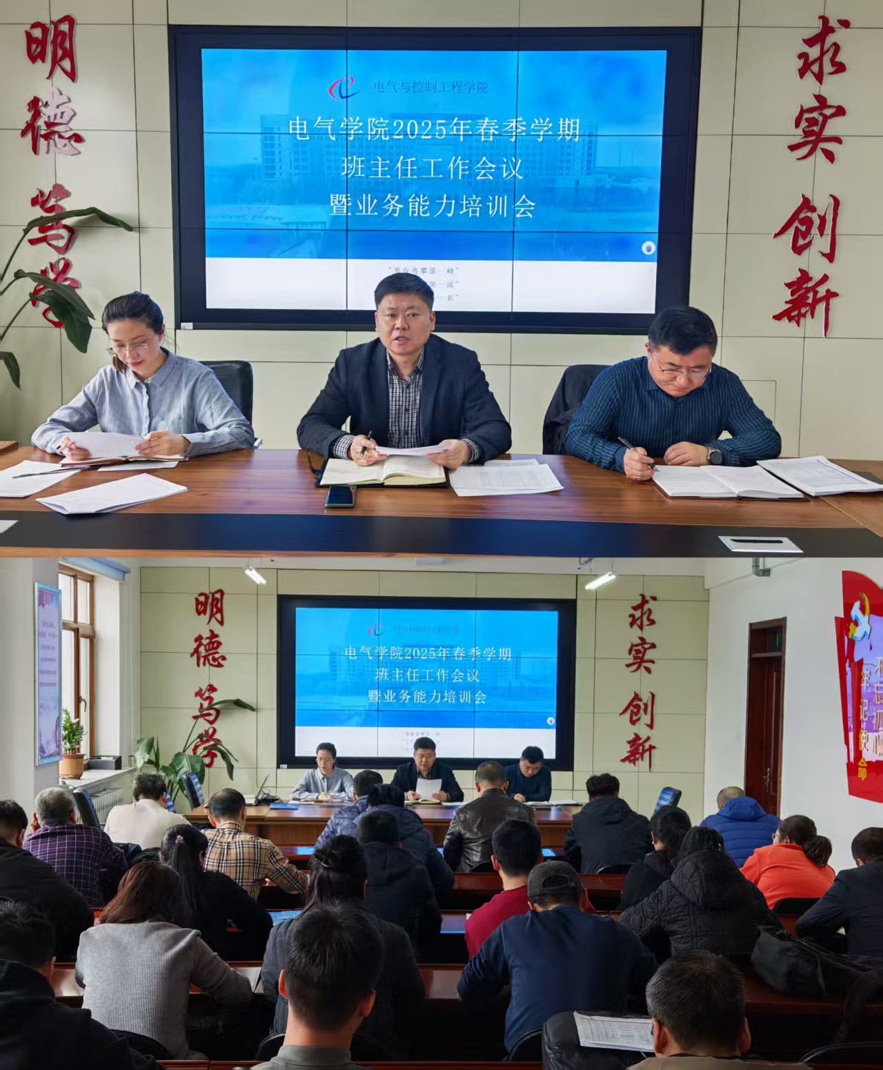 为进一步强化班主任队伍建设,提高班主任业务素质能力,3月25日中午,电气学院在朝阳楼0809会议室组织召开了2025年春季学期班主任工作会议暨业务能力培训会,学院全体辅导员、班主任参加会议,会议由学院党委副书记侯树成主持。