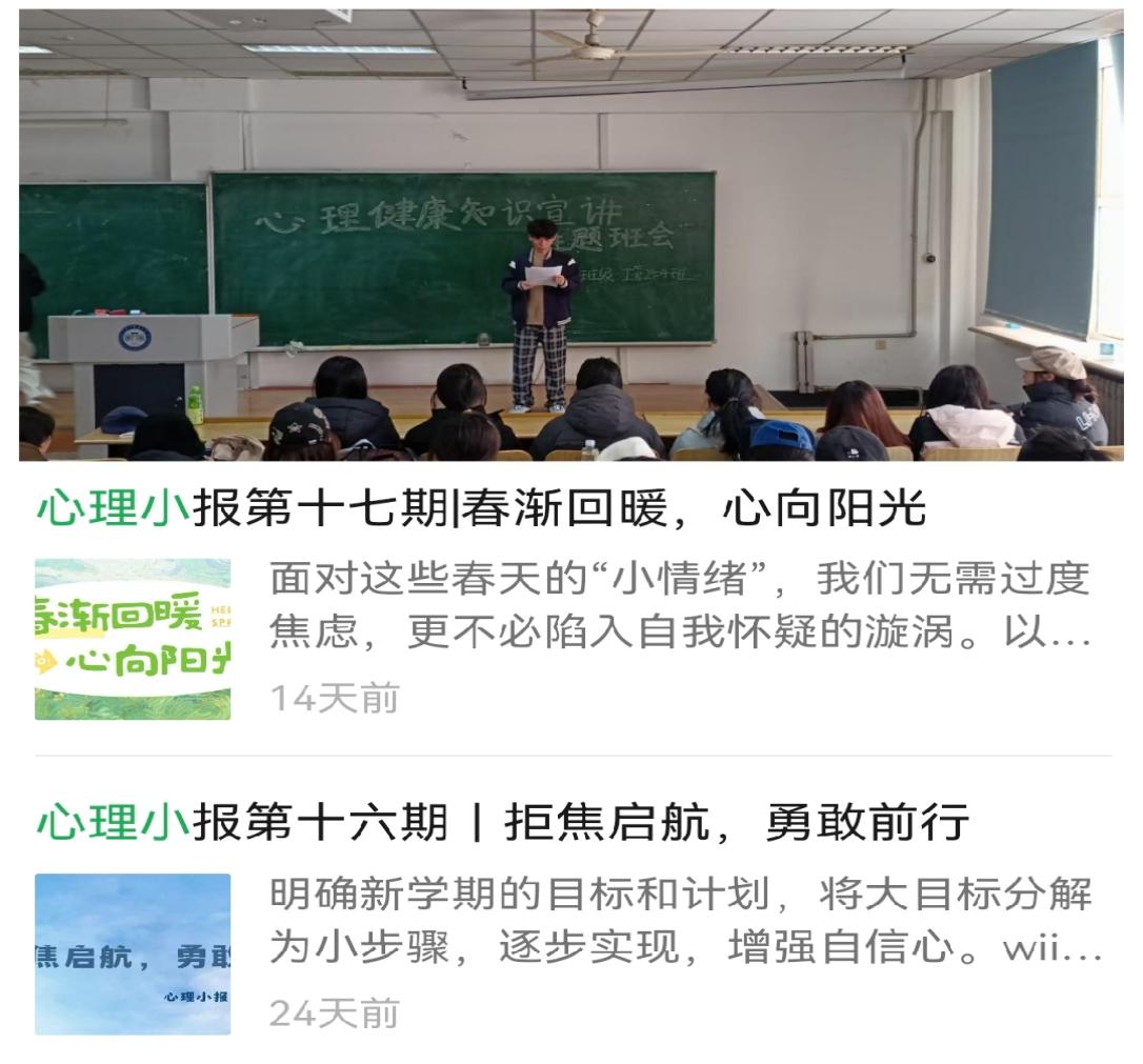 班会启智润心田,小报传音播心语。学院组织了一系列心理健康主题班会,通过生动的案例研讨、贴近实际的情景模拟等多种形式,将心理健康知识以寓教于乐的方式普及给每一位学生。在管院之声平台定期推送“心理小报”作为心灵的窗口,为学生送上温暖与启迪,至今已累计推出十八期,深受学生喜爱。学院通过线上线下双轨并行育人模式,将思政教育与心理育人有机融合,夯实学生思想根基。