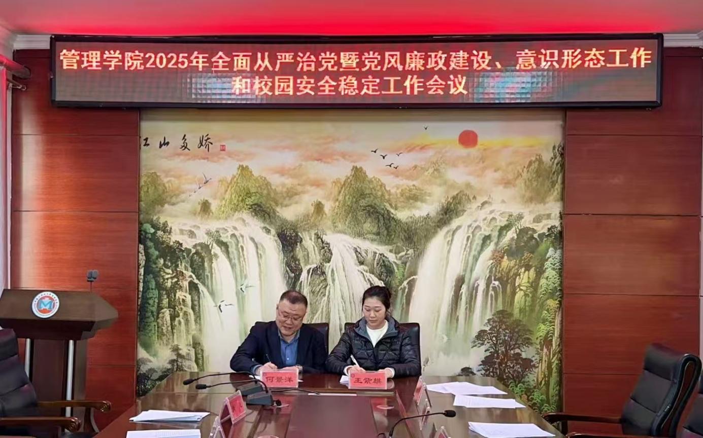 院长洪亮对学院2025年全面从严治党暨意识形态工作责任书和校园安全稳定责任区的划分情况进行解读说明,分析研判当前学院面临的安全工作形势,要求全院党员、干部要牢牢守住校园安全稳定底线,认真学习并带头落实好两个责任书中的具体条款,以高水平安全护航学院高质量发展。随后,何景洋代表学院党委与班子成员、教师和学生党支部书记签订《2025年管理学院全面从严治党暨意识形态工作责任书》。洪亮代表学院党政领导与班子成员、系(办、中心)负责人、辅导员签订了《2025年管理学院校园安全稳定工作责任书》。