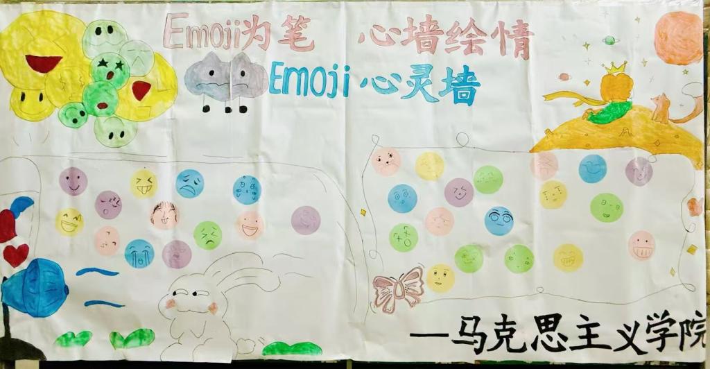 智育支撑,让朋辈心理健康教育“有广度”。学院依托红色资源,以红色基因赋能心理健康教育,通过开展参观红色教育基地、地方产业资源等体验式教育,助力思想政治教育,增强朋辈心理韧性。开展“Emoji为笔,心墙绘情” Emoji心灵墙活动,创新了朋辈心理互动范式,将心理健康教育转化为具象的情感认知实践,引导学生袒露内心真实情感,正视自身情绪状态,构建起一个充满温暖与包容的心灵交流空间。