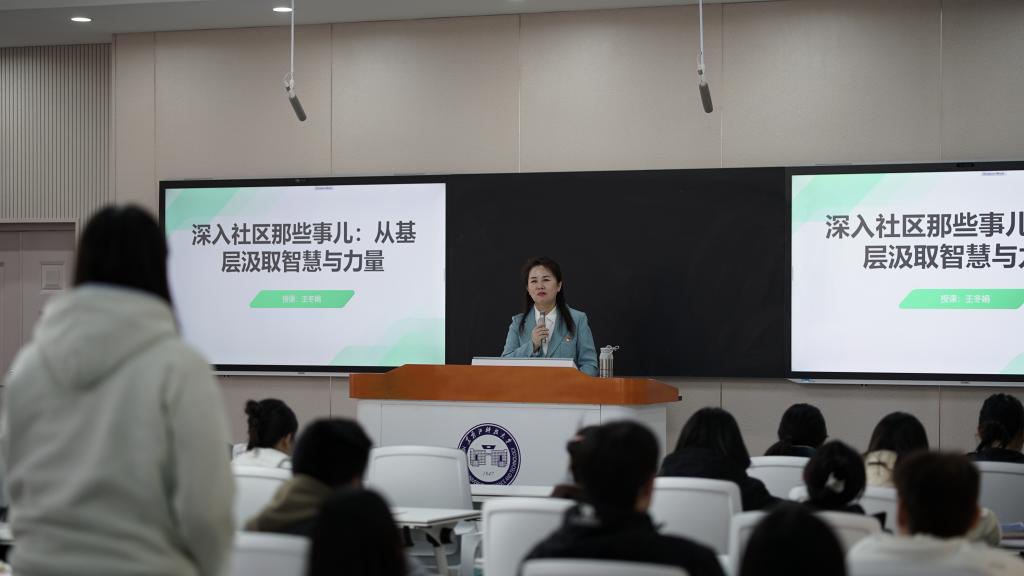 讲座中,王冬娟凭借自己17年丰富的社区工作经验以“深入社区那些事儿:从基层汲取智慧与力量”为主线,通过人口普查攻坚、红色议事平台、应急管理实战、特殊群体服务、矛盾调解艺术和党建引领路径等六个维度的实务案例展开分享,详尽地诠释了社区工作的本质是人的工作,既要当好政策落地的“最后一公里”,更要成为居民心坎中的“最近一厘米”的社工之心。鲜活的案例让学生直观感受到,基层工作既要具备“穿针引线”的统筹能力,更需涵养“枝叶关情”的为民情怀。社会工作系主任吕娜表示,此次跨界授课不仅是一次实践经验的传递,更是一次职业精神的洗礼,为学院持续推进“双师课堂”“社区工作站”等协同育人项目,构建“课程对接岗位、教学对接实务、培养对接需求”的立体化人才培养体系提供了接地气的“邻家”数据。