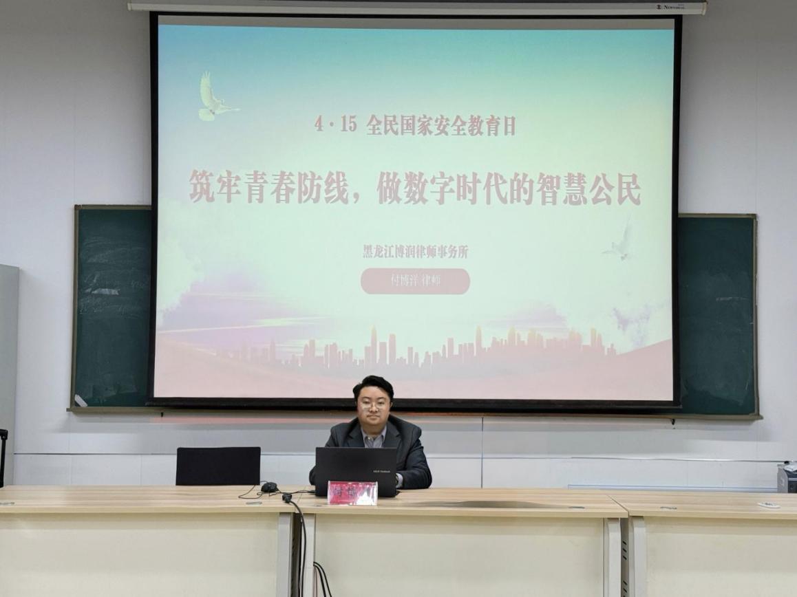 为深入贯彻落实习近平总书记关于加强国家安全教育的重要指示批示精神,提升青年学生国家安全意识和素养,管理学院于4月14日在学院ERP教室举办了全民国家安全教育日专题法治讲座,本次讲座特邀黑龙江博润律师事务所付博洋律师,为师生们带来了一场精彩的法治教育课。管理学院党委副书记徐海英、全体辅导员及学院团学骨干代表共计150余人参加讲座。